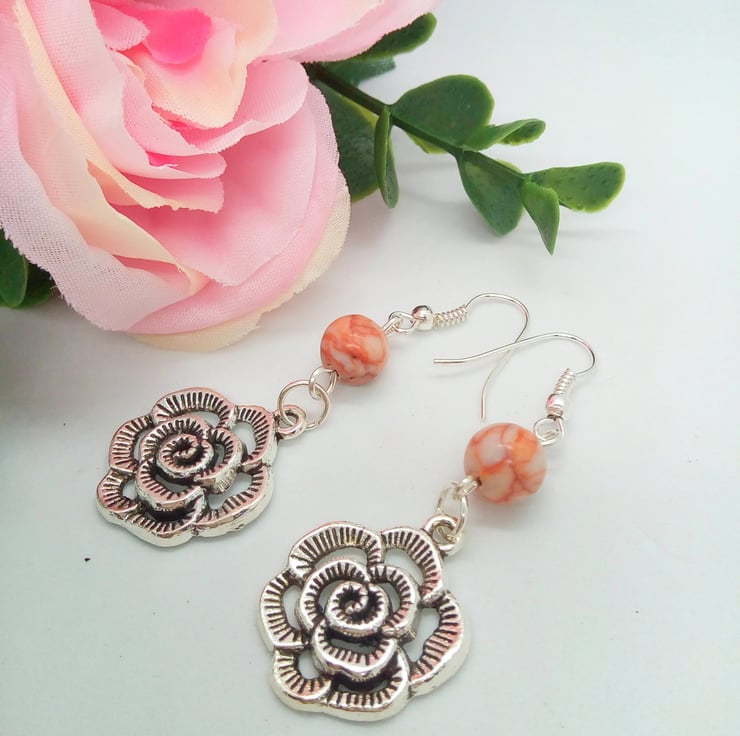 A stunning 3 piece semi precious jewellery set comprising a necklace, bracelet and earrings. It is light and easy to wear and would be great to wear everyday or for an evening get together. The necklace is made using 8 mm pink spider jasper beads with delicate hints of white and pale grey. It has a 40 mm x 35 mm silver plated rose charm on the necklace and the earrings have smaller 20 mm rose charms. The bracelet is threaded on jewellers elastic and has a single 6 mm silver plated bead at the centre. The necklace is secured with a silver plated lobster clasp and the earrings have silver plated ear wires. The necklace is 16.5 inches (42 cm) in length with a drop of 1.5 inches (4 cm) for the rose charm. The bracelet is 7 inches ((17.5 cm) long unstretched. and it will comfortably fit a 7 - 7.5 inch (18 cm - 19.5 cm) diameter wrist. The earrings have a drop of 1.5 inches (4 cm) from the base of the ear wire. The jewellery set will be dispatched wrapped in tissue paper in an organza bag and delivered to you via Royal Mail first class post.