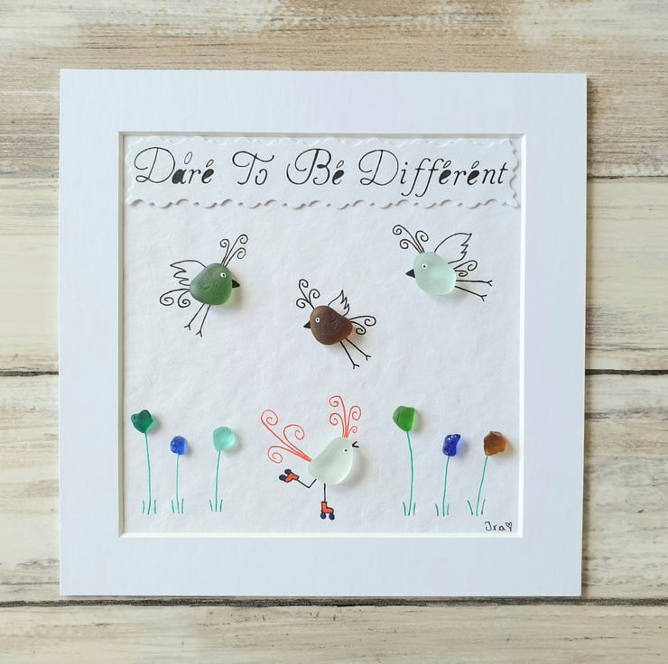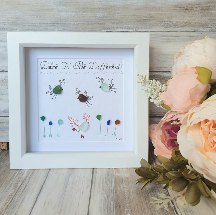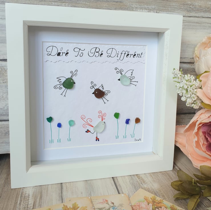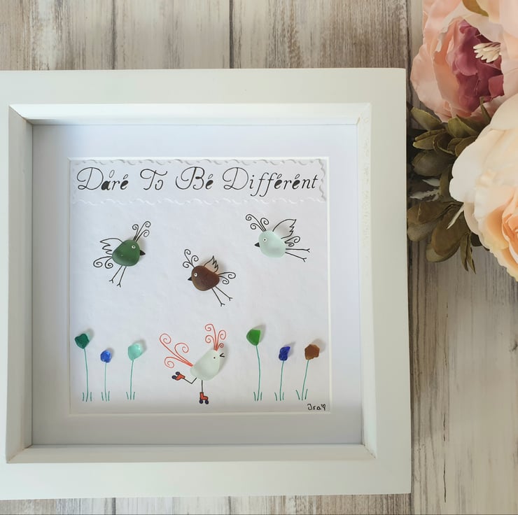 We all need a little reminder that it's ok to be different. What better way than to have a cute artwork with a unique bird on roller skates doing its own thing! This white rustic frame was created with seaglass on watercolour paper. "DARE TO BE DIFFERENT" will make a cute addition to any home or as a gift to someone special. The frame will come with glass measuring appropriately 19cm x 19cm. All photos were taken without glass to avoid reflections. Loose items are for photo purposes only.