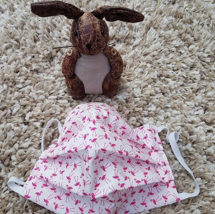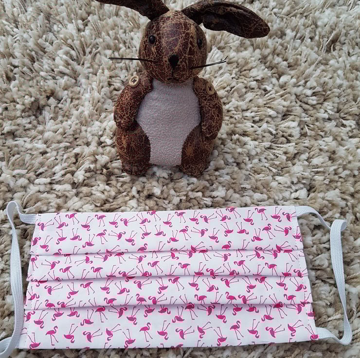 Adult face covering/mask made from a tiny pink flamingo print on ivory cotton. The face mask is made with 2 layers of cotton forming an inner pocket for a filter (not included) and is fastened over the ears with 2 loops of elastic and a toggle adjuster.