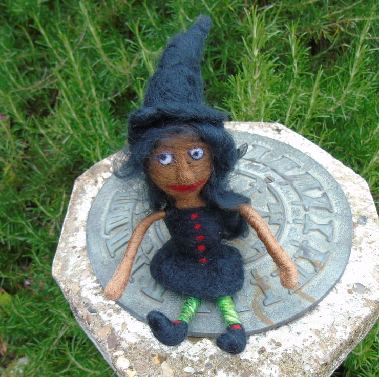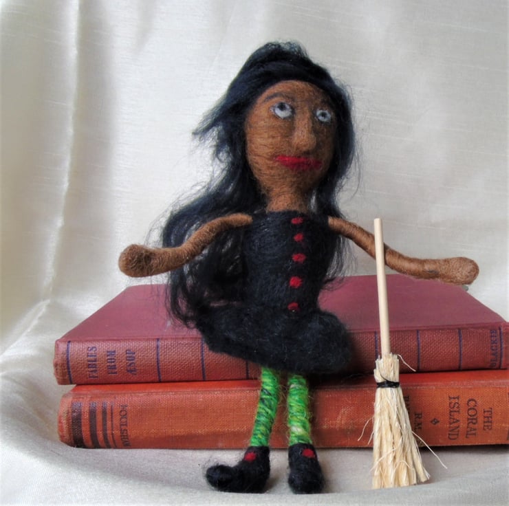 She will happily sit on a shelf. She is a friendly witch and would love to come to your home bringing good luck and happiness.