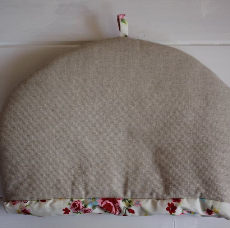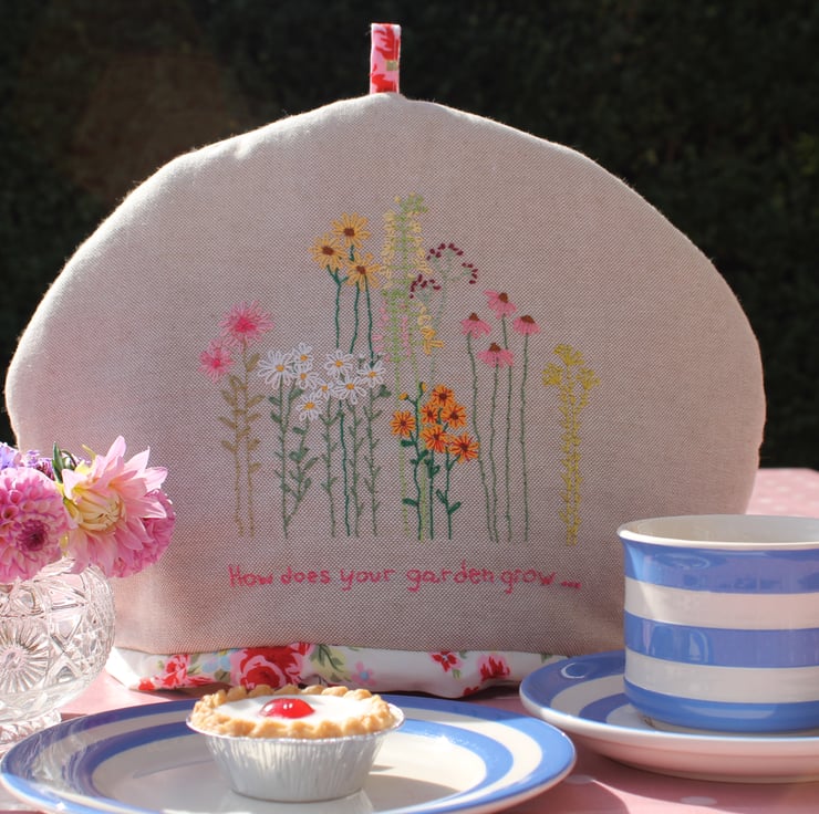 SAMPLE. A natural linen tea cosy with a cream floral cotton lining and co-ordinating tag on the top. The front has hand-embroidered flower details with hand-stitched wording saying 'How does your garden grow ...' The cosy is lined with polyester wadding to keep your tea nice and warm.