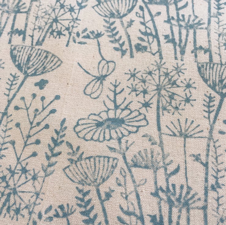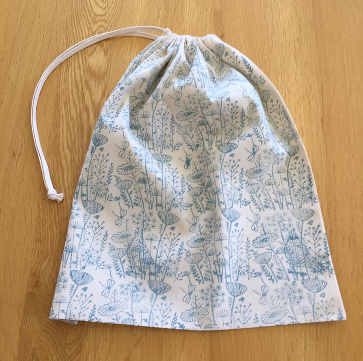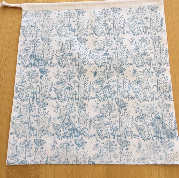 Hand block printed cotton drawstring bag measuring approx 38cm by 43cm in a lovely in the meadow design, see if you can spot the hidden chickens! Makes a perfect wash bag, alternative gift bag, laundry bag, shoe bag, kids toy bag, sports kit bag, nursery bag, school bag, or just for keeping bits and bobs in! Hand block printed on both sides.