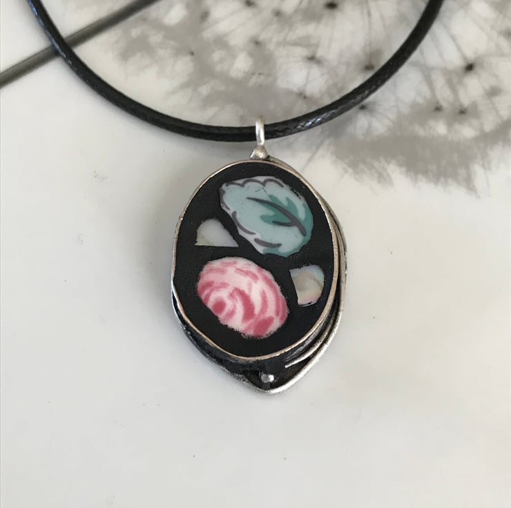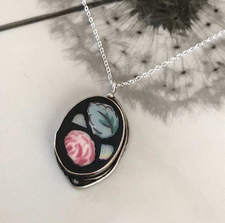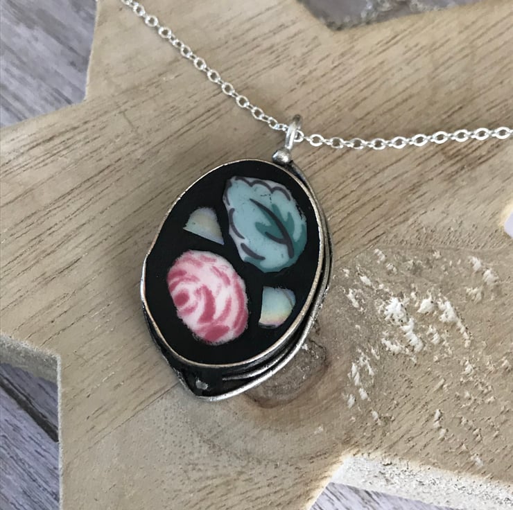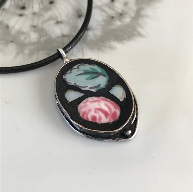 Incorporating my love for mosaics I have made a small range of China and mosaic jewellery. This beautiful deep set oval bezel is made from antique silver plated brass. The centre has been filled with small pieces cut from a Cath Kidston plate. Black grout has then been used to finish and to make the china really stand out.