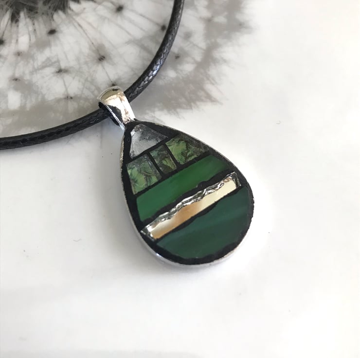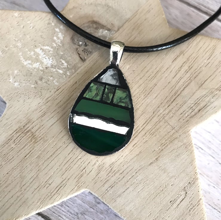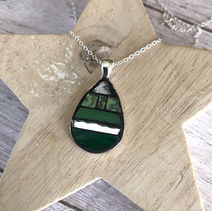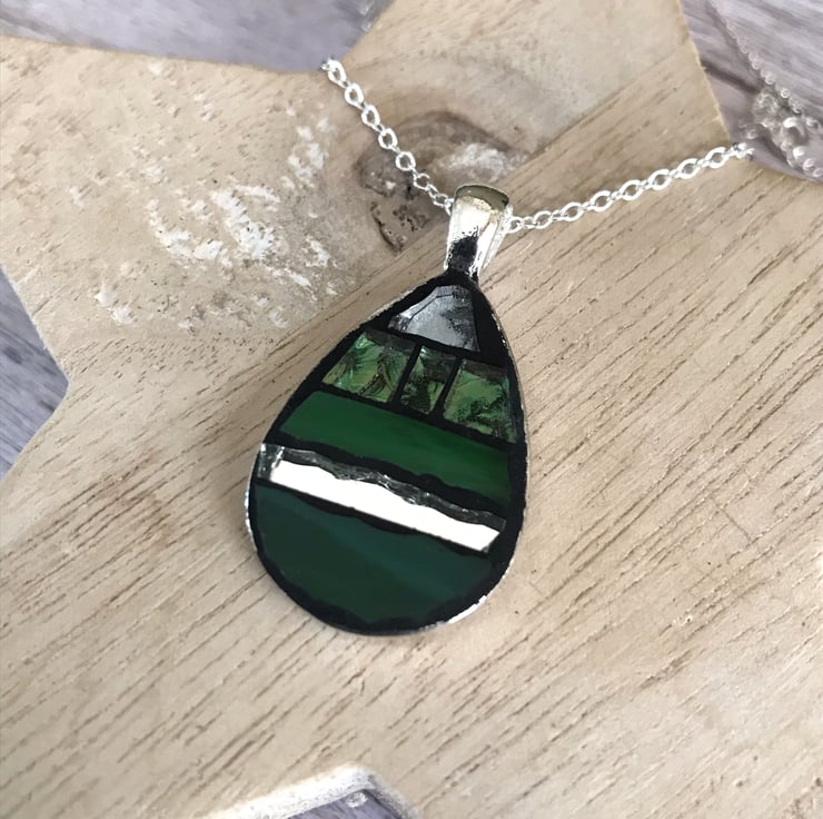 Incorporating my love for mosaics I have made a small range of China and mosaic jewellery. This simple peardrop mosaic pendant has been made using hand cut glass in various shades of green, silver and mirrored tiles all set in black grout. A really striking modern piece of jewellery.