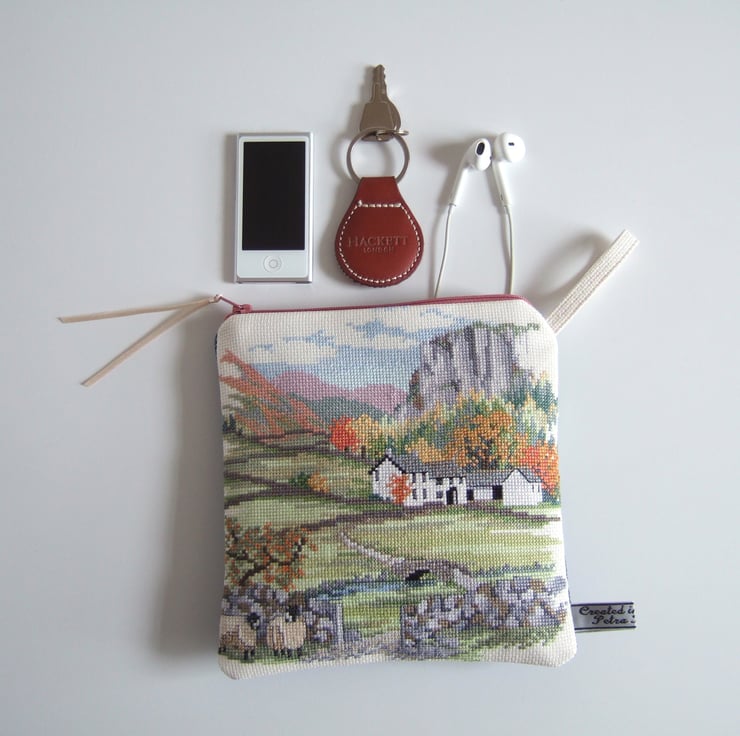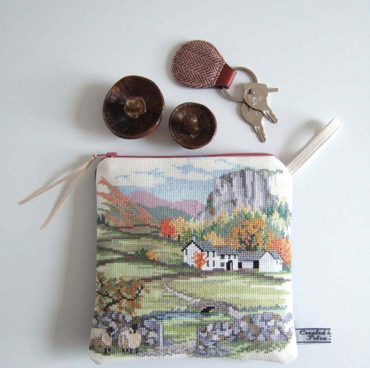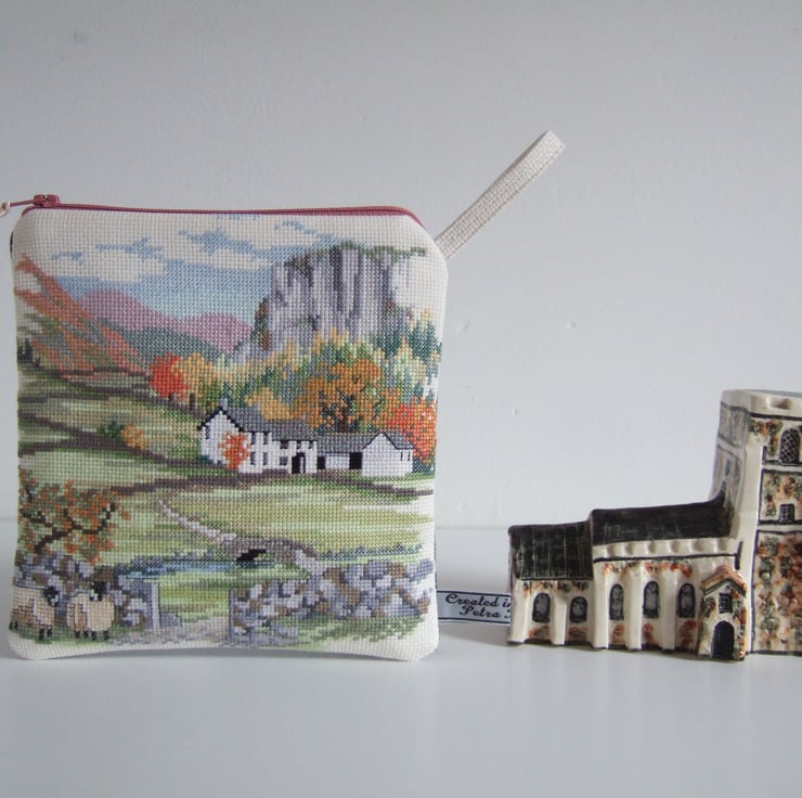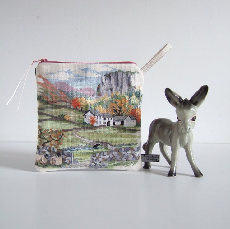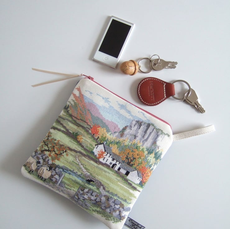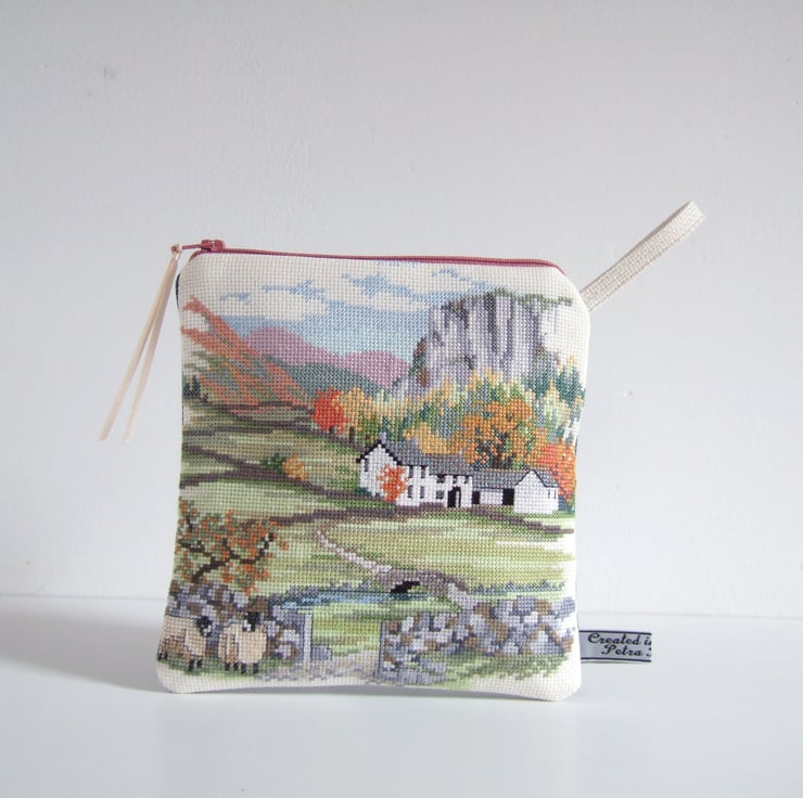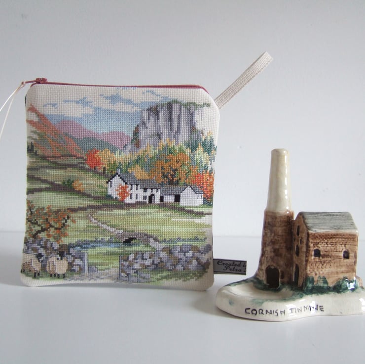 This charming vintage cross stitch make up bag has a wonderful countryside illustration on the front.Possibly The Yorkshire Dales, with its crags, cottages, sheep and dry stone walls! Tho it may just be The Lake District. It is a nice size for make up for a weekend away, or for keeping ipods and headphones tangle free. It would also make a fun place to store holiday memories.This one off little bag would make a lovely present for someone who likes to roam the countryside, or maybe for a friend who is learning to embroider or anyone needing a virtual hug right now.