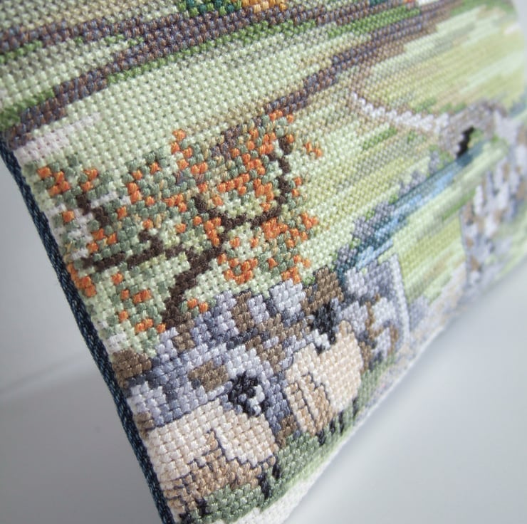 What a fabulous find this wonderful little vintage cross stitch sampler turned out to be. I think it is probably a view in the Dales, possibly around Malham with its pretty dry stone walls, sheep and running beck. It is nice to give it a practical use and hope many more people will get to see its pretty cross stitch charms.