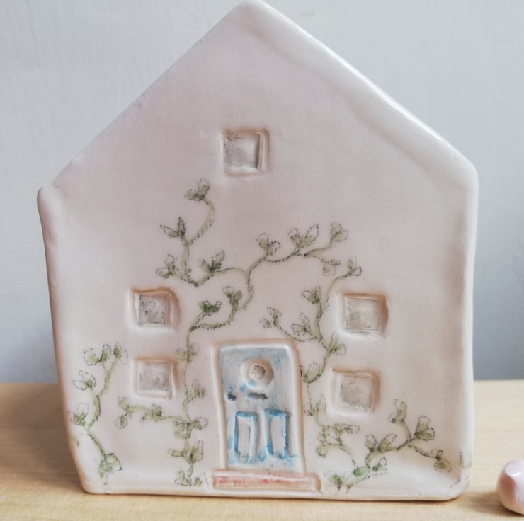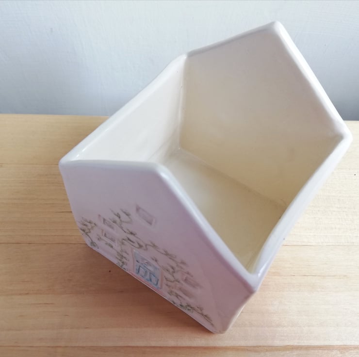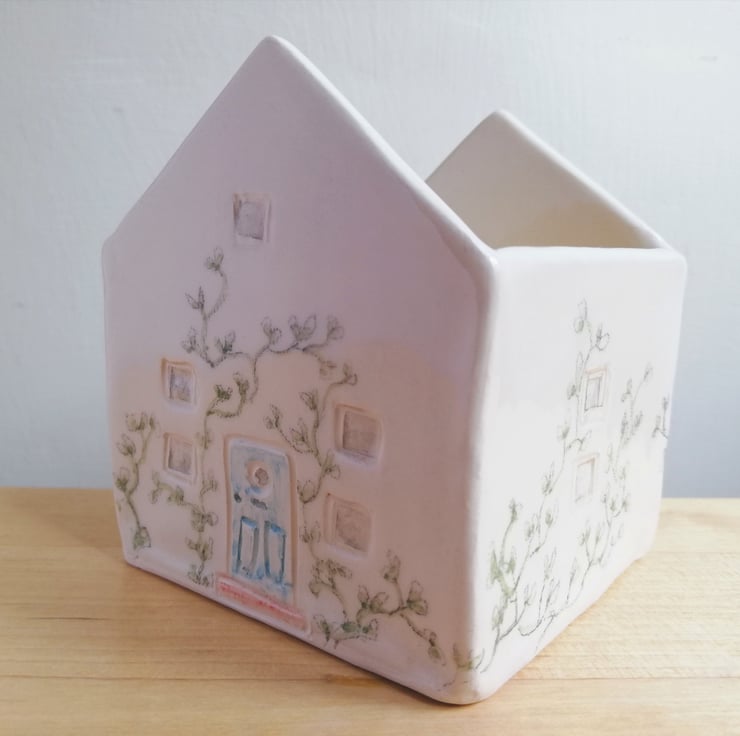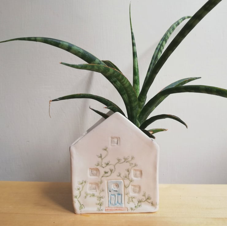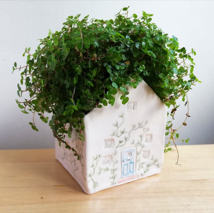 Hand made pottery house plant pot with hand painted creeper plants and open roof. Slow growing succulents look like a green roof in this planter.
