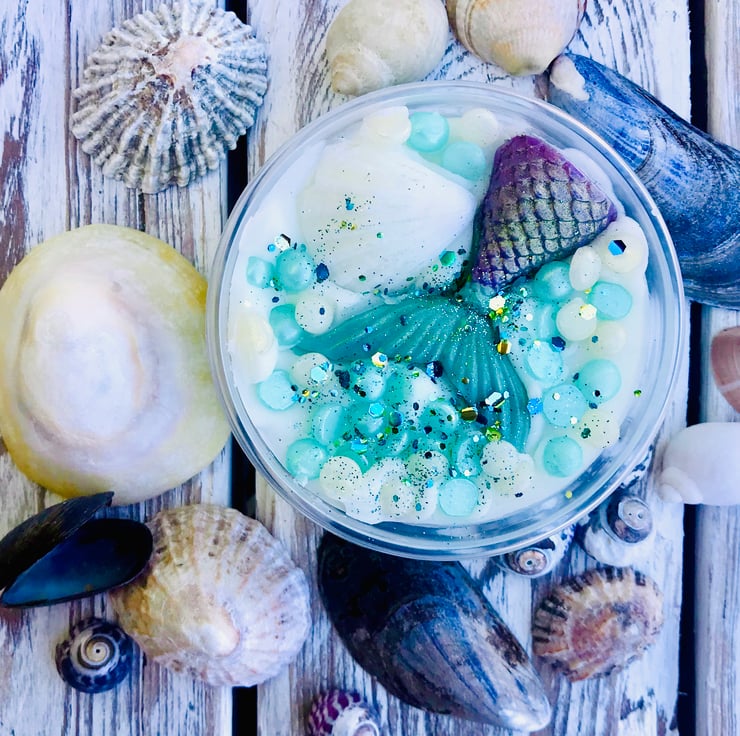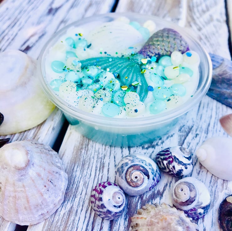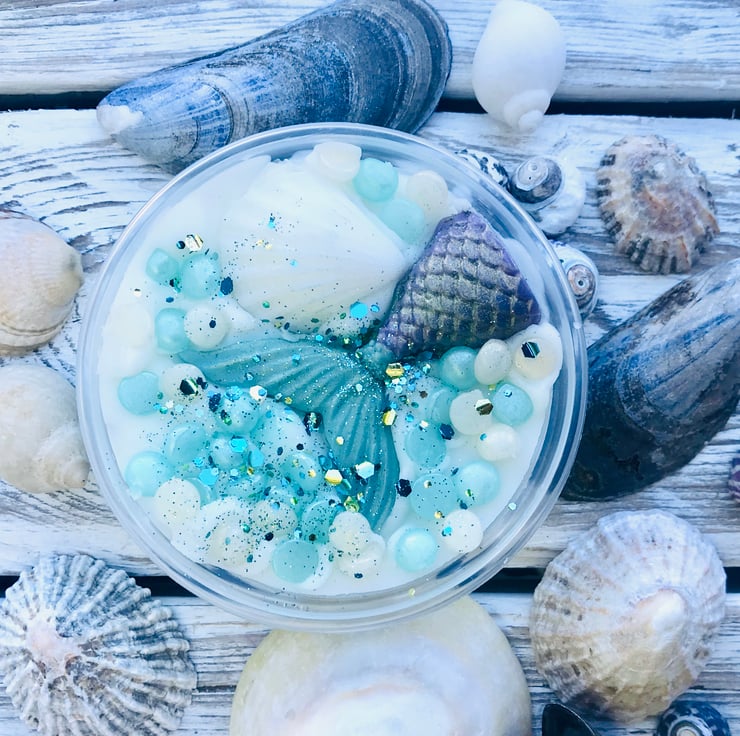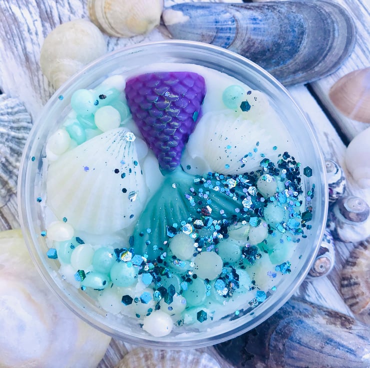 Our highly scented long lasting Mermaids Tale Wax Tart have a fruity tropical fragrance with a fresh, cool opening, supported by sweet notes of coconut and pineapple, with floral nuances of lily and Jasmin on a base of soft woods.
