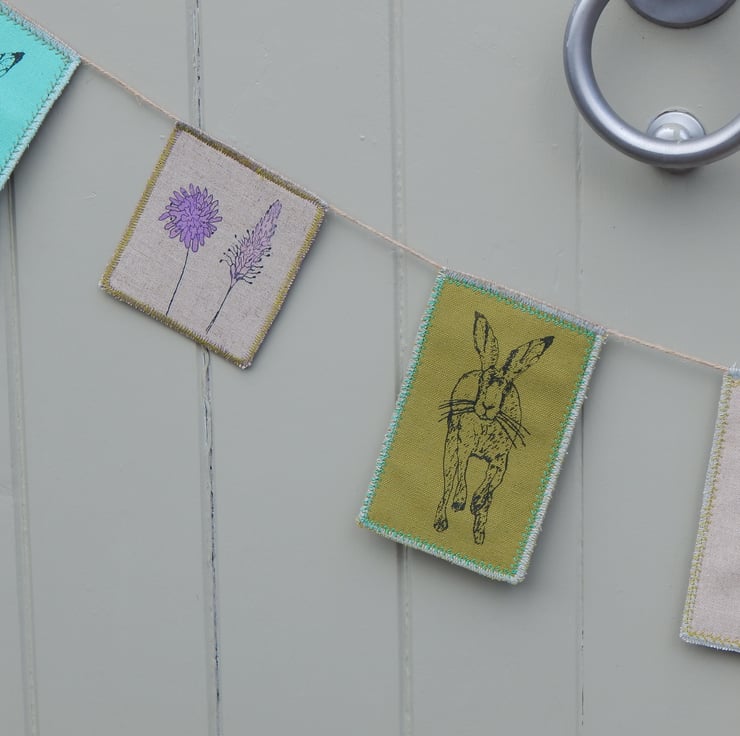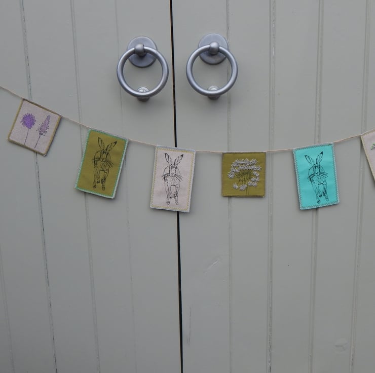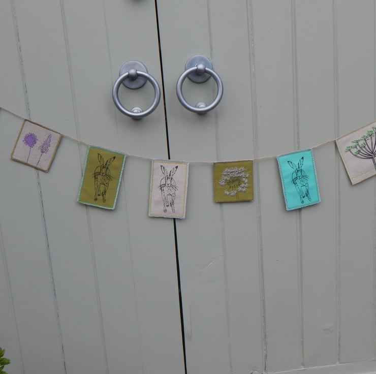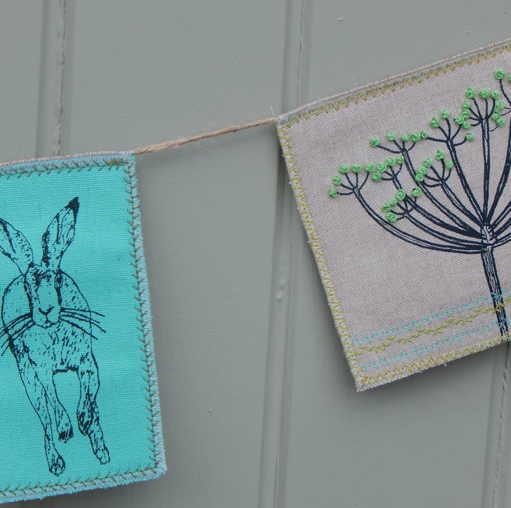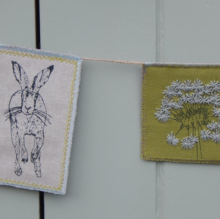 There are 4 panels with screen printed running hares on 3 different coloured cottons. They measure approx. 17 cm x 10cm. They have zig zag stitching to the edging to stop fraying then there is a lovely decorative green stitch on top to frame the hare. There is a dandelion clock that has been screen printed then the seed heads are hand embroidered in grey, this measures 12cm by 12cm. There is a cow parsley screen printed then French knot hand embroidery for the flowers with green decorative machine stitching to the base of the panel, measures 16 x 15cm. There is also a panel with scabious and plantain that have been screen printed then hand painted to make them pop with colour, 12cm by 11cm.