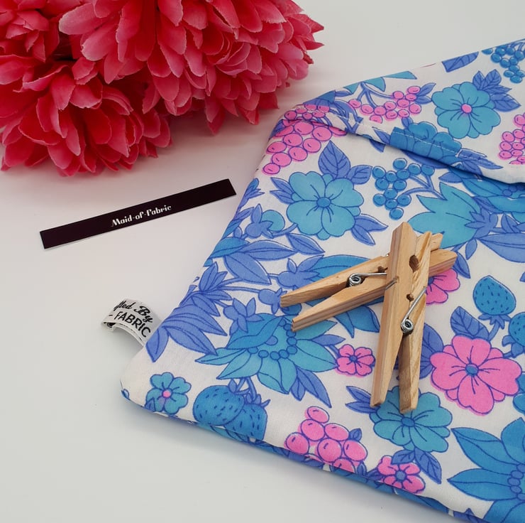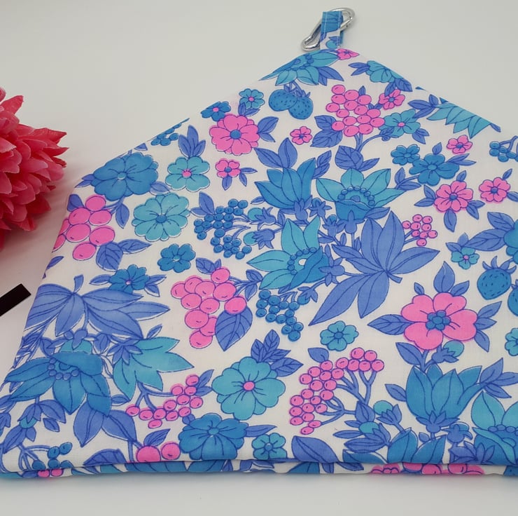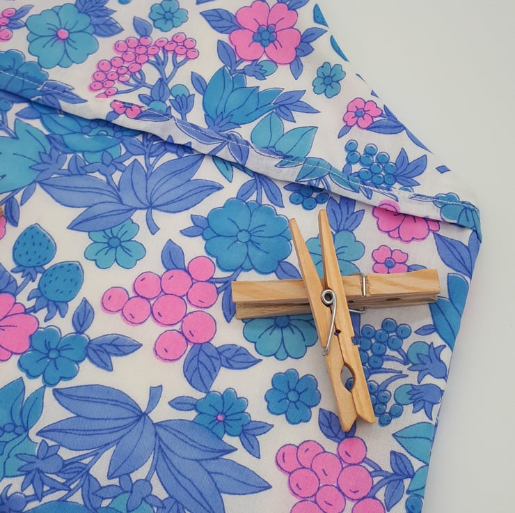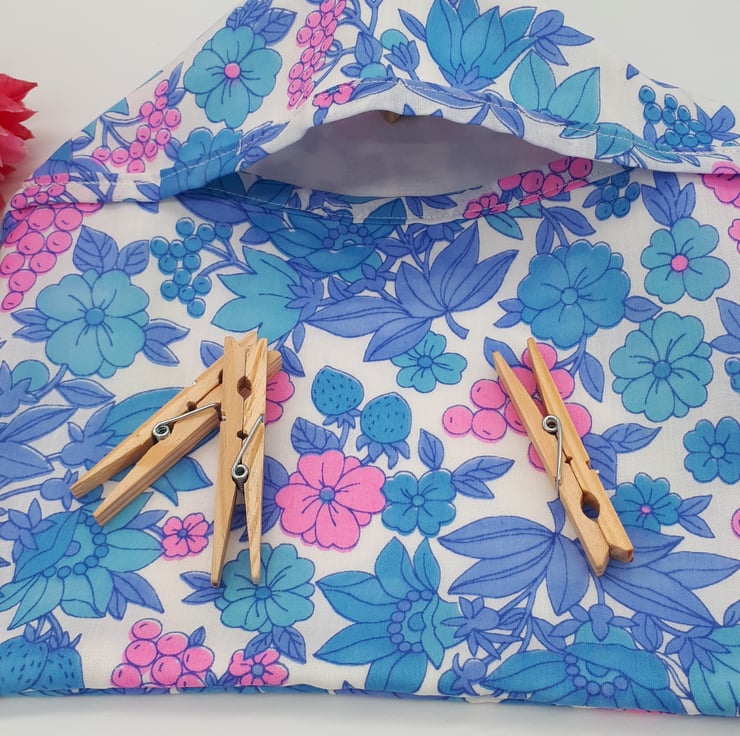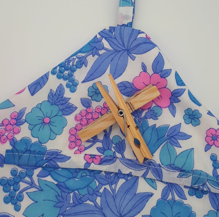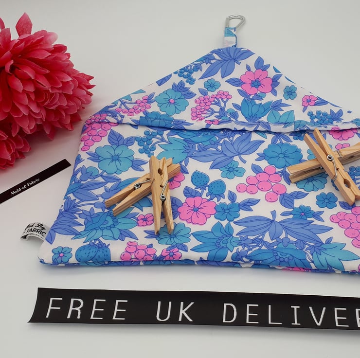 Peg bag made using a blue, pink and white cotton fabric and white lining.