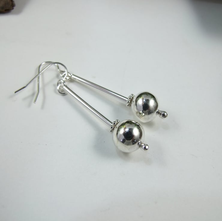 I have created the large 10mm silver beads by hand, cutting 4 discs from silver sheet then doming to form 'half' a sphere. These were then soldered together to create a full sphere. These are paired with thin silver tubes and filigree bead spacers. Fitted to sterling silver earwires.