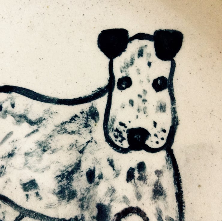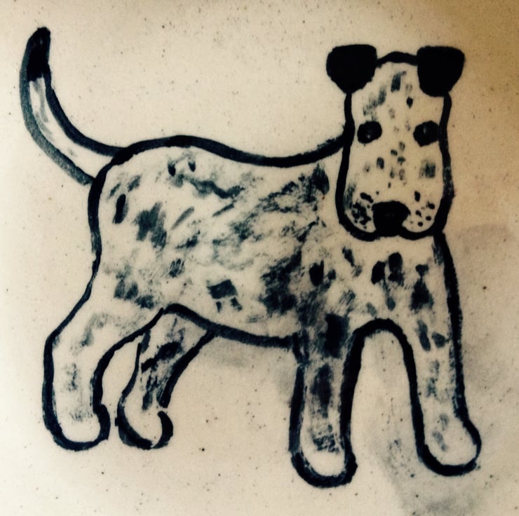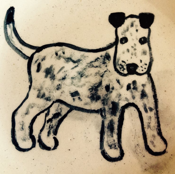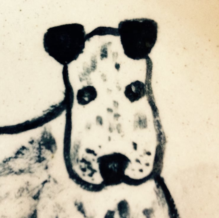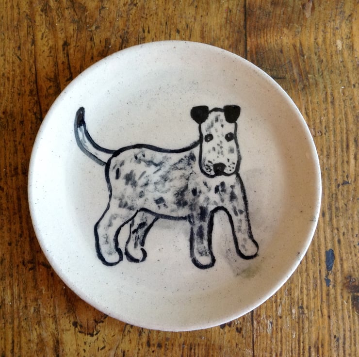 Very charming stoneware plate decorated with a hand painted line drawing of a little dog in black. The plate is hand thrown in tough high fired stoneware clay and it has a glossy transparent glaze. It is 19.5 cms in diameter and is dishwasher and microwave safe. The perfect gift for any dog lover.
