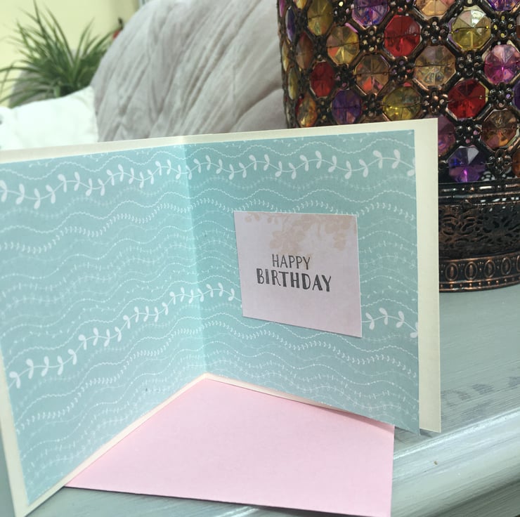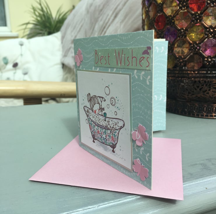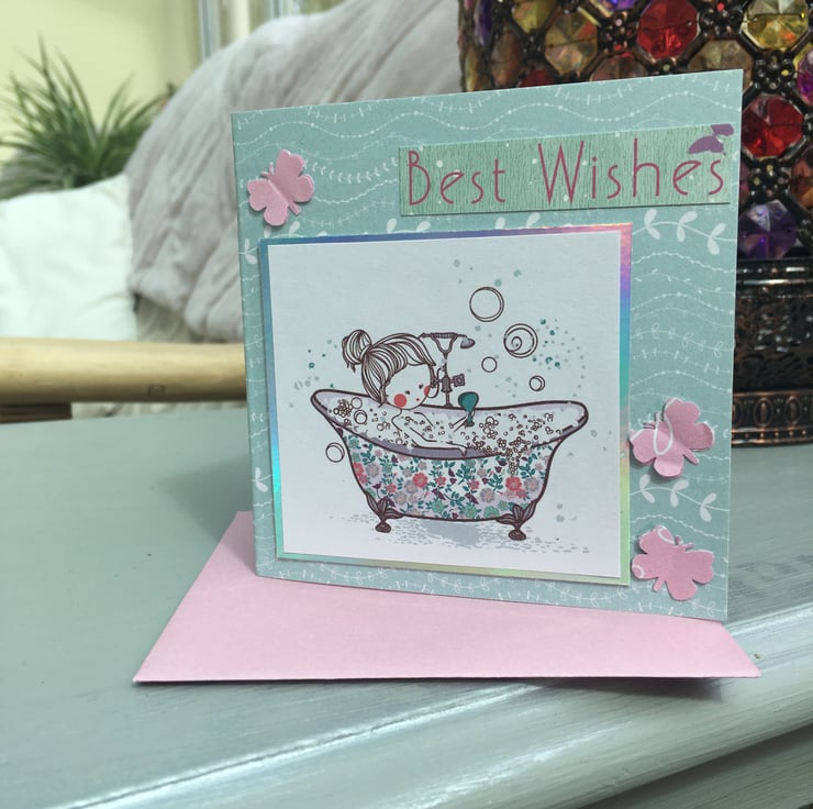 A cute little card to send birthday greetings. A small card with a lady in an old fashioned claw foot bath, bubbles are everywhere. The design is on silver mirror card and a duck egg backing. Butterflies and a best wishes greeting finishes the design. The insert is in matching paper and the greeting says Happy birthday. It comes in a handmade pink envelope.