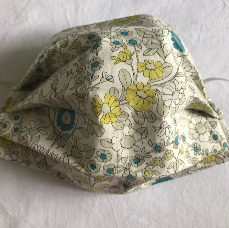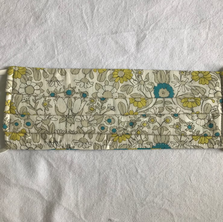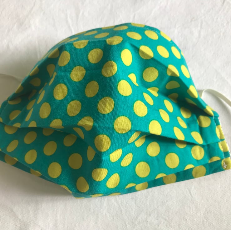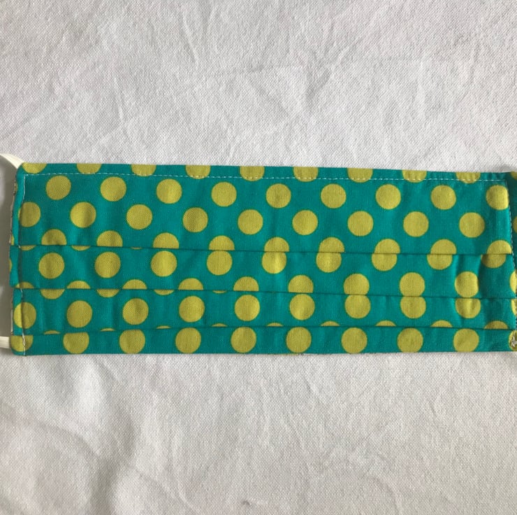 Double sided, this reusable face masks has a pretty floral pattern in creams with a lime and turquoise accent on one side and a lime polka dot on turquoise background pattern on the reverse. Can be worn either way.