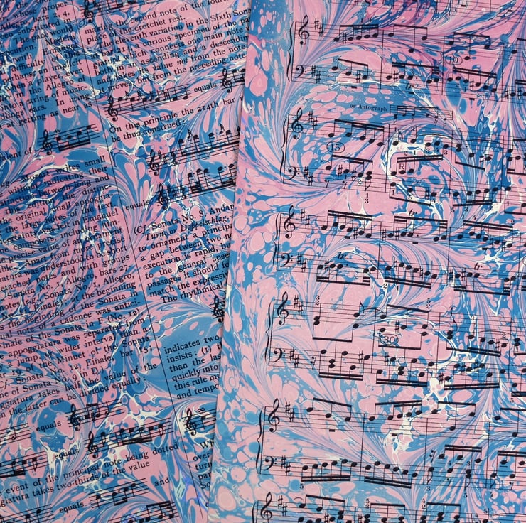 Discover the beauty of these vintage music ephemera sheets marbled in a delightful pink and Prussian blue drawn stone pattern. Each sheet measures 31x22.3cm and has been marbled with the same design, making them a perfect matching set.
