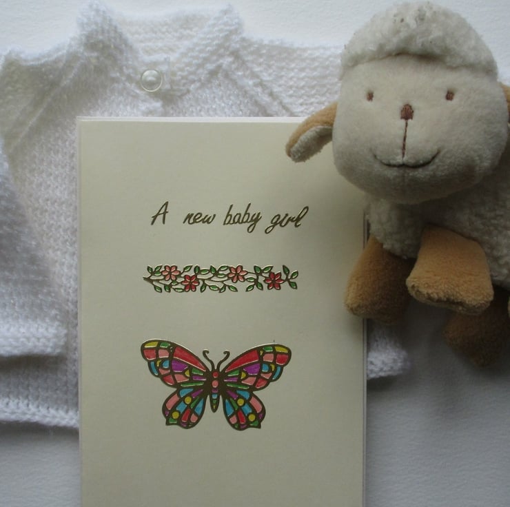 This 7" x 5" butterfly new baby girl card is blank inside for you to write your own message. I have used commercial stickers but have coloured them in using felt tip pens. The card is accompanied by an envelope of the same colour and can be sent sealed in a compostable biofilm wrapper.