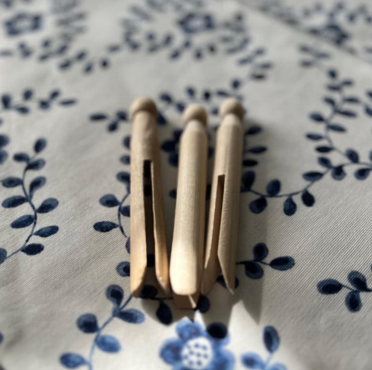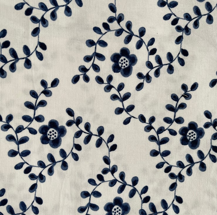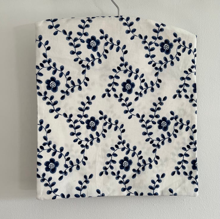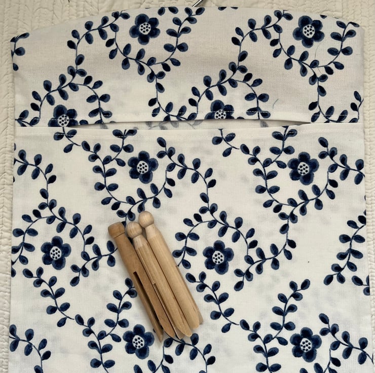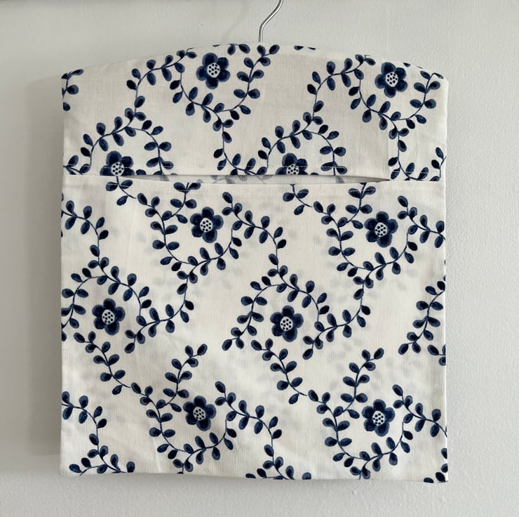 This handmade peg bag is constructed out of IKEA cotton canvas type fabric featuring a pretty crisp navy blue flower on a white background. The hanger is wooden and with a metal hook and the bag's seams are finished using an overlocker.