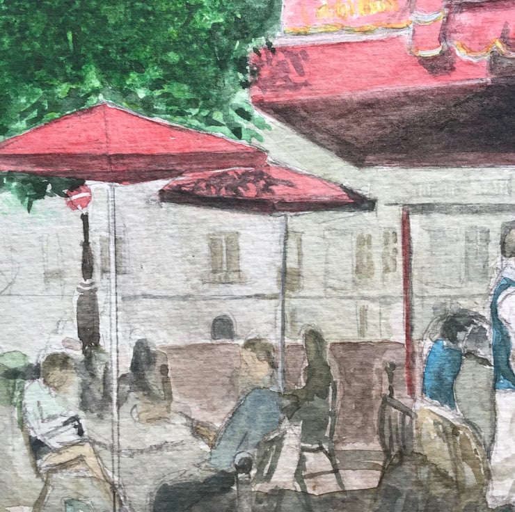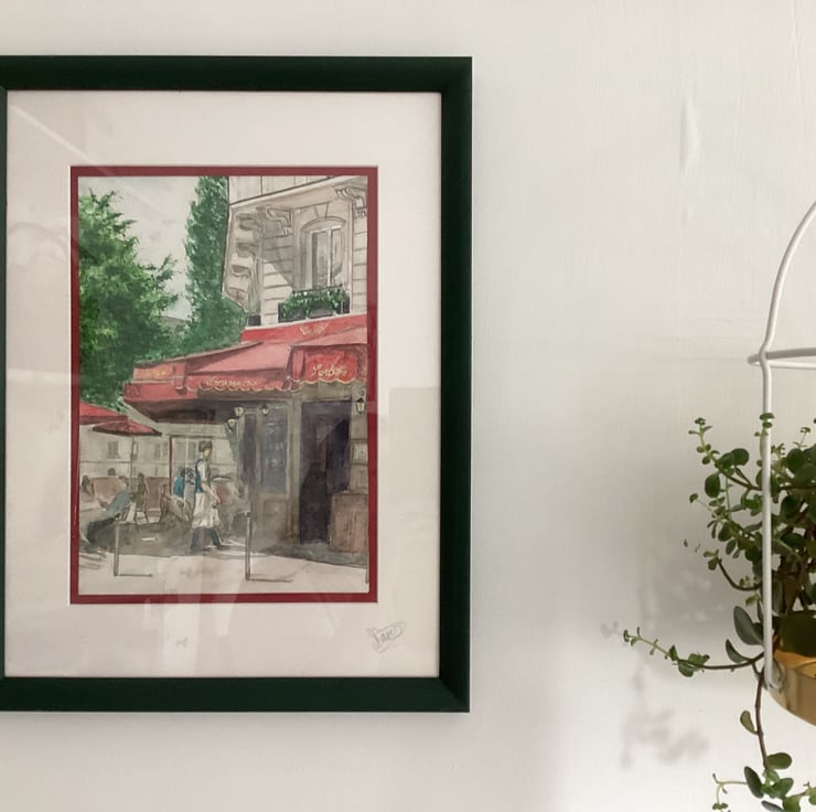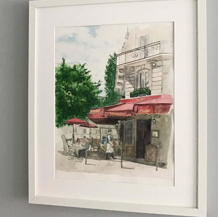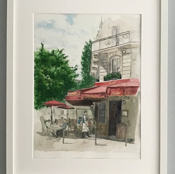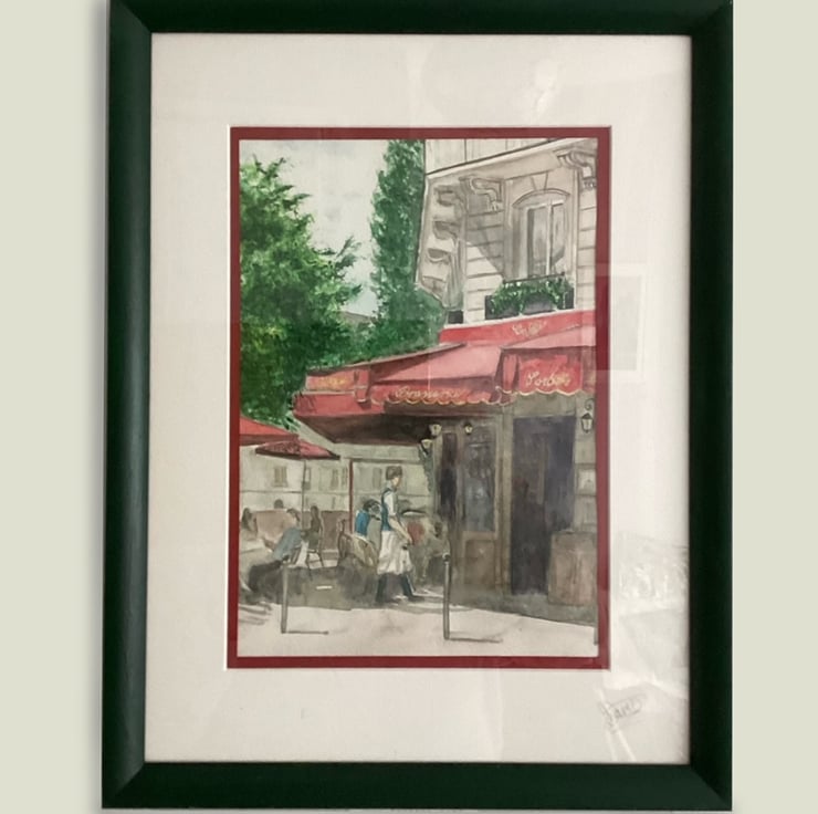 A lovely, original watercolour painting of a Cafe in Paris. Artwork measures 420mm x297mm (A3) without mount. Sold mounted and framed, as primary image. Please note that the frame is refurbished.