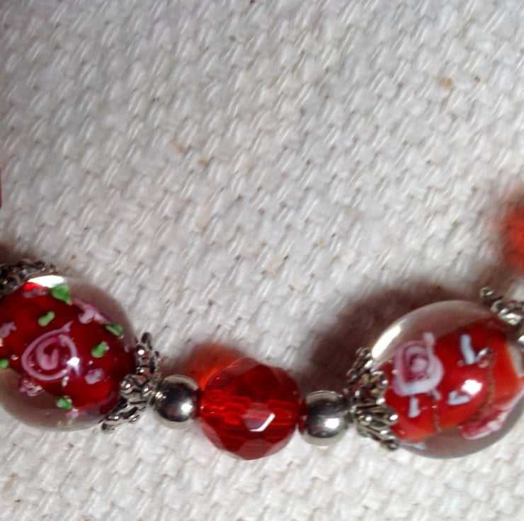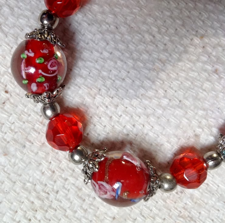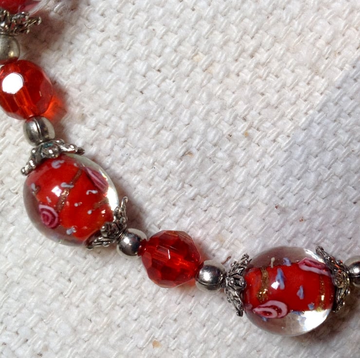 A collection of pretty vintage red Murano glass beads strung together with silvertone beads and bead caps.