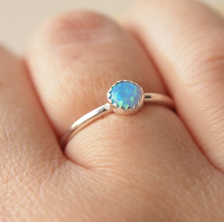 A sparkly Lab Blue Opal set by hand onto a band of Sterling Silver. The ring is simple in design to show off the beauty of the gemstone and has a zig-zag feature where the stone meets the silver. The ring features October's birthstone, Opal and is a simple and modern birthstone ring that can be stacked with any ring from my collection. The band is a fully round profile measuring 1.5mm, which perfectly balances the 5mm sized gemstone.