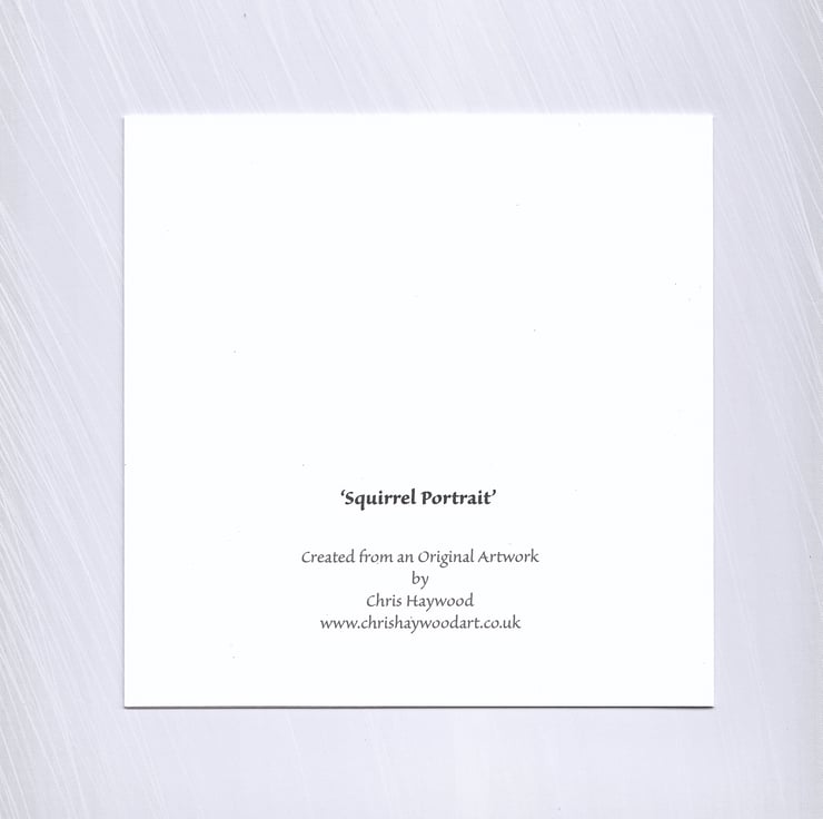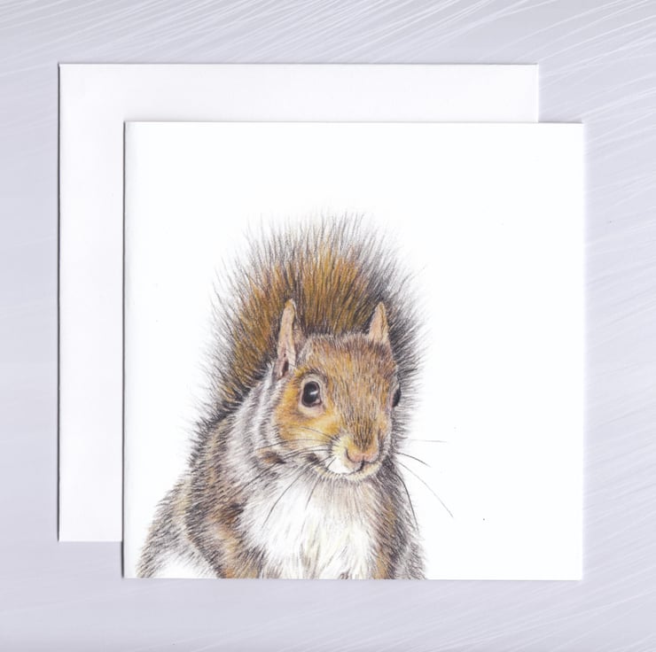 An inquisitive grey squirrel on a greetings card for any occasion, taken from my original coloured pencil drawing.