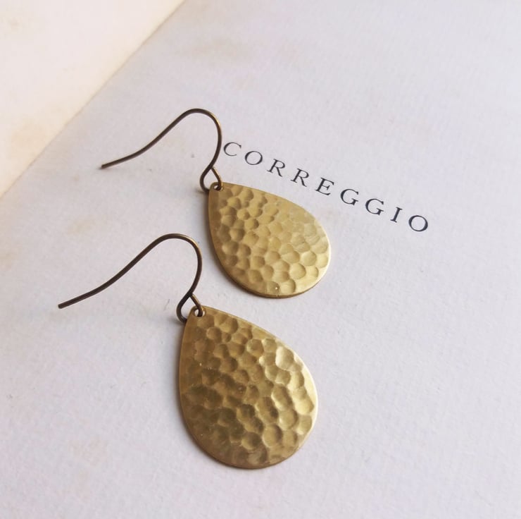 These hammered teardrops are beautifully textured. Hung simply on bronze hooks.