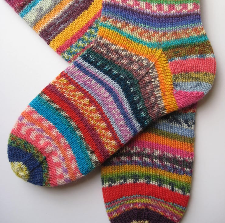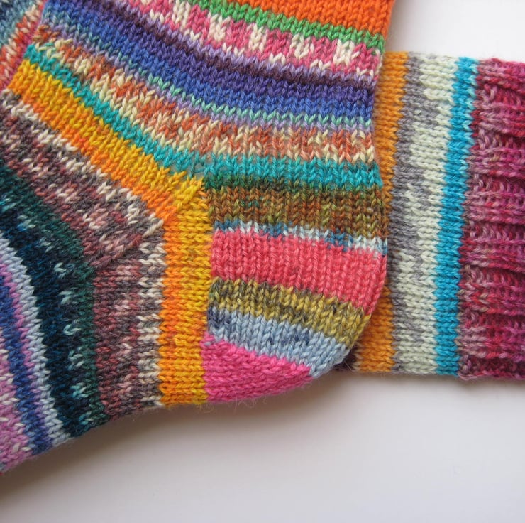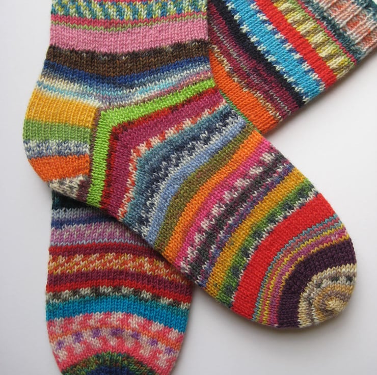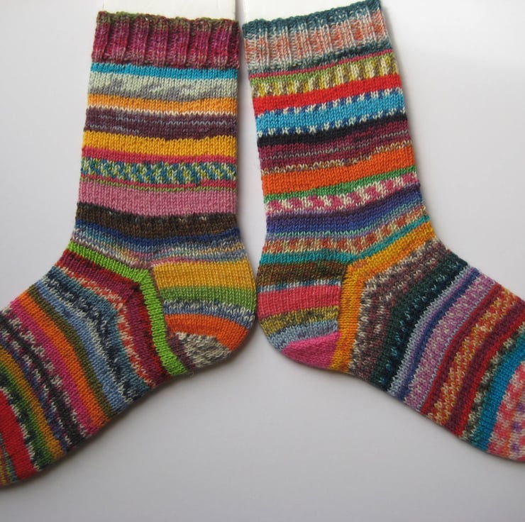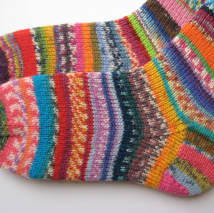 Hand knitted in the round on 5 double pointed needles, these scrappy wool socks are made from many different 4 ply self patterning sock yarns. Made from 75% wool 25% polyamide yarn, in just about every colour you can think of! Made from very fine yarn, they are not thick and will fit most footwear. Warm and durable, these socks will keep your feet comfortable and bright throughout the year. A truly unique pair of socks that will cheer up any feet!