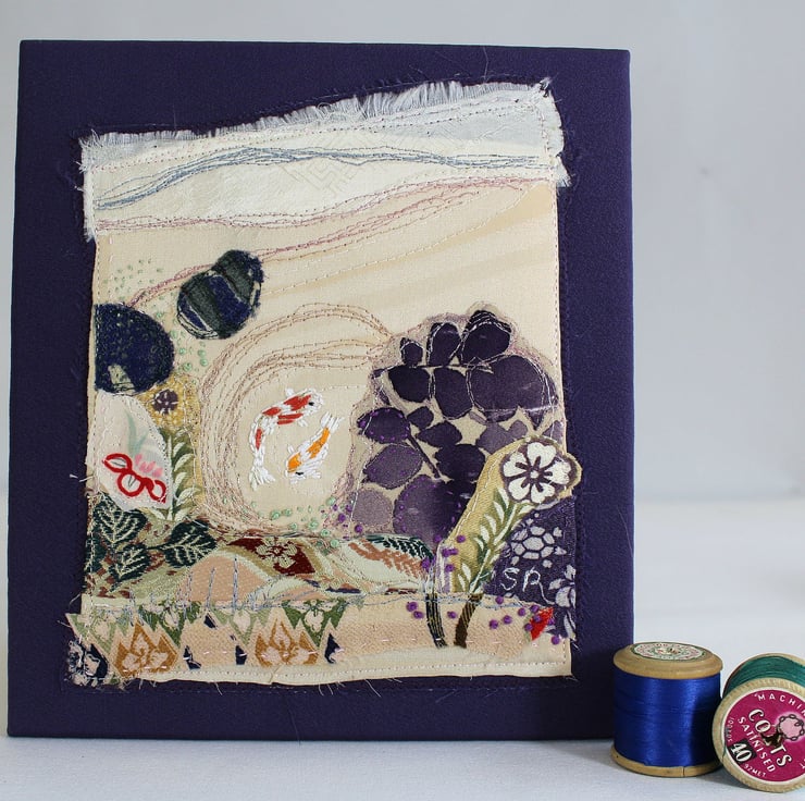 This original piece of textile art measures 20 x 23 cm. The picture was made using vintage kimono silk fabric from my collection, with free motion machine embroidery. The fish were hand embroidered. The picture is stretched over a wooden frame 1 cm deep like a canvas. It is lined on the reverse and there is a hanging loop. It would also look good in a frame.