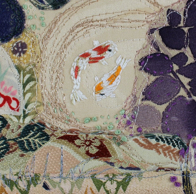 I have visited Japan several times and have a collection of kimonos and fabrics. The beautiful silk fabrics are inspirational to work with. I have many wonderful memories of visits to Japanese gardens.