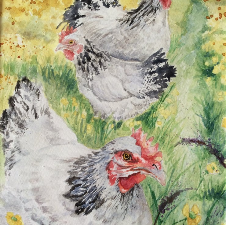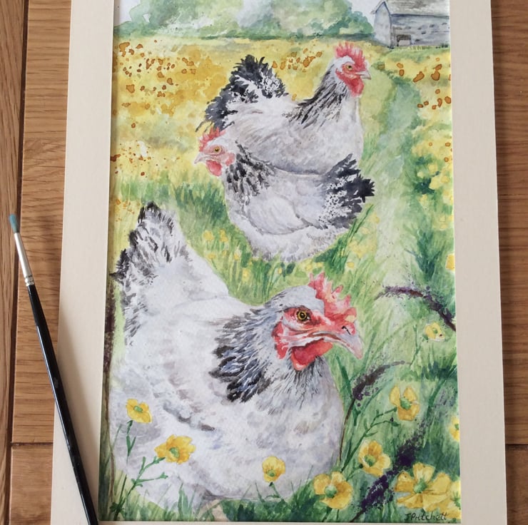 I am a watercolour artist and successfully sell my artwork online and in a local craft shop.This painting is an original watercolour painting and not a print. The painting has been painted on watercolour paper using watercolour paints and is a perfect example of my style of artwork. I use a range of watercolour techniques such as wet on wet, resist and splattering to create my unique style. These chickens are definitely free-range, as they are enjoying the summer sun wandering around a meadow full of buttercups.The dimensions are approximately 30 x 21cm which includes a 2cm mount for easy framing. The painting depicts three chickens peeking around a field full of buttercups.