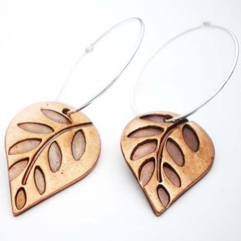 Solid copper teardrop shaped earrings with a falling branch and leaf texture, hung on hoop style sterling silver earring wires. Made from recycled copper, a great eco freindly choice!