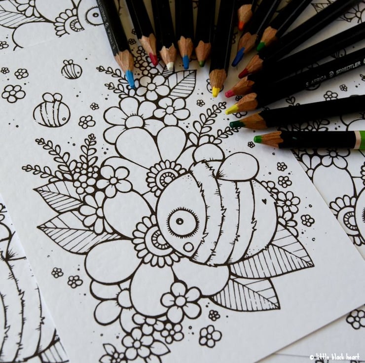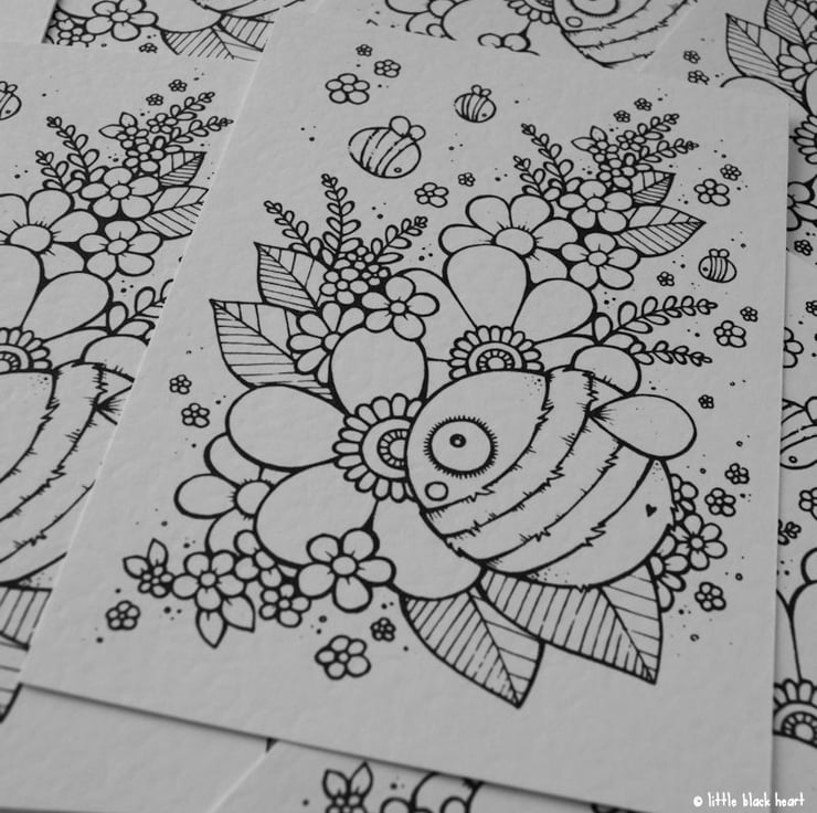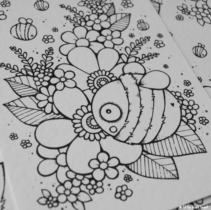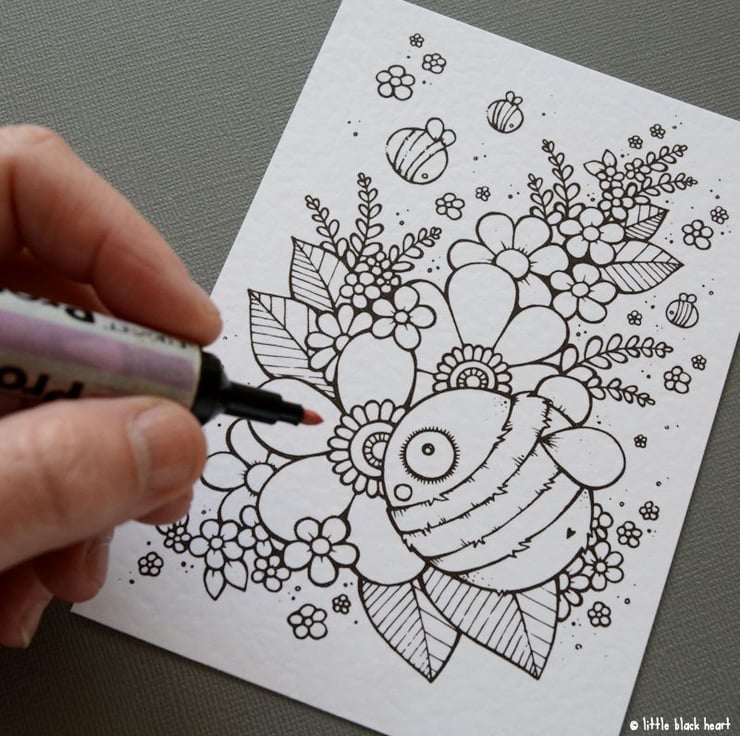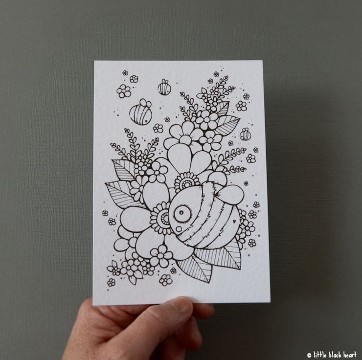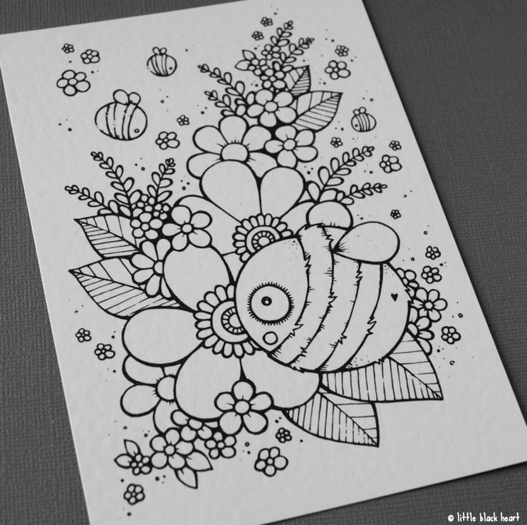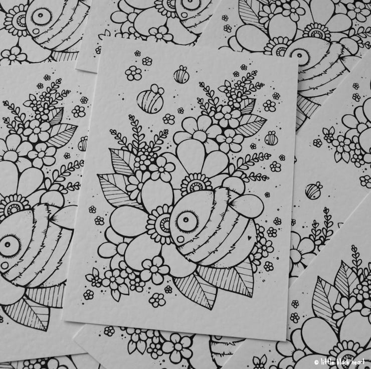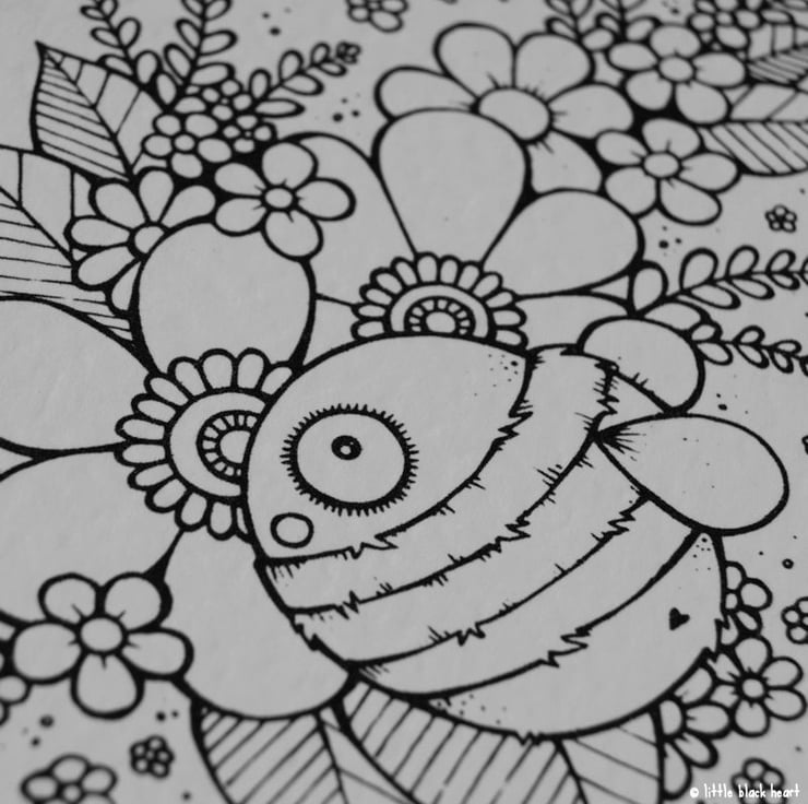 this sweet bumble bee is surrounded by blossom... he's just waiting for you to add some colour to his life! great for use with art pens, coloured markers, coloured pencils, crayons, or any other 'dry' art media you wish to use.