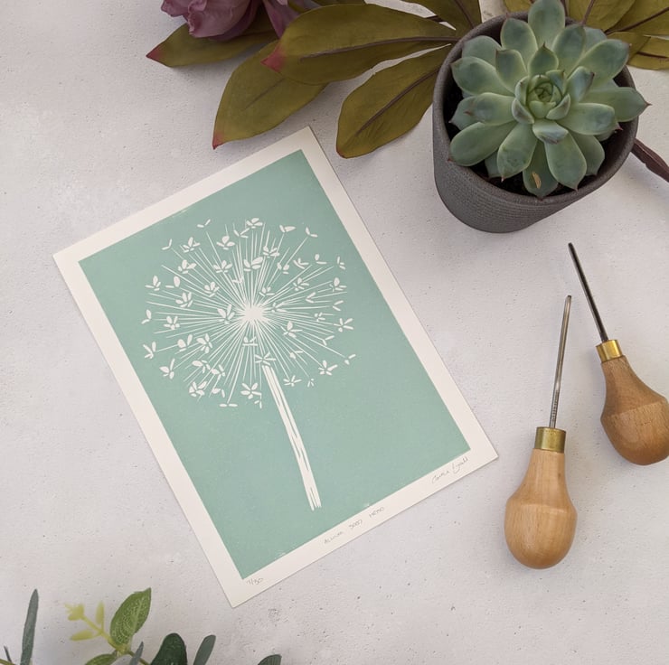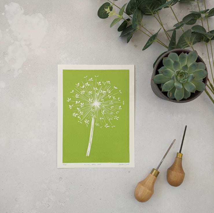 A limited edition linocut print of an Allium seed head.