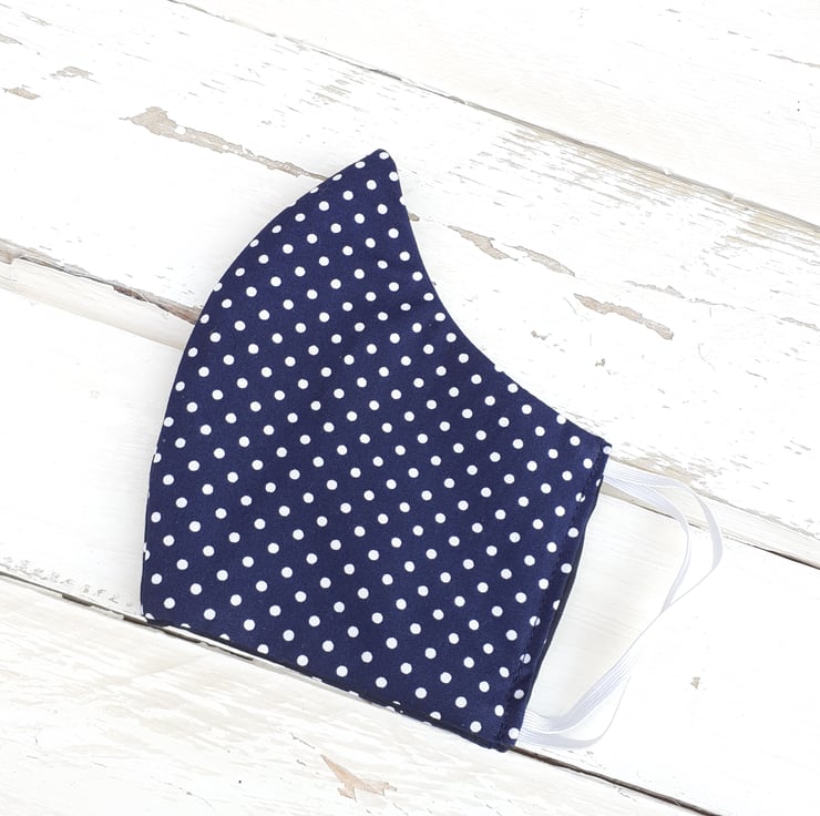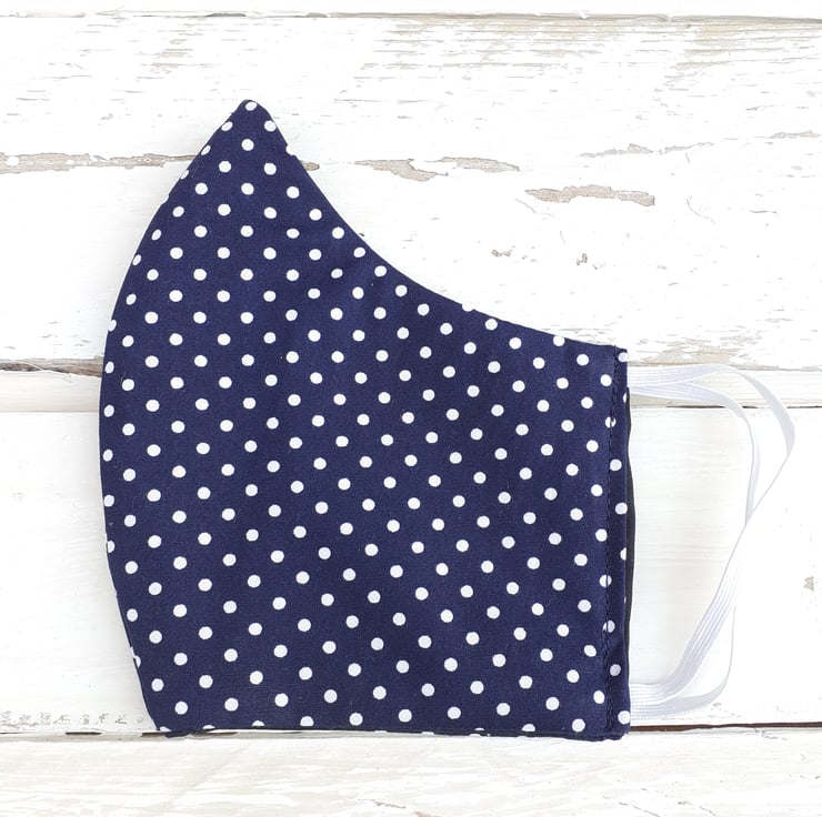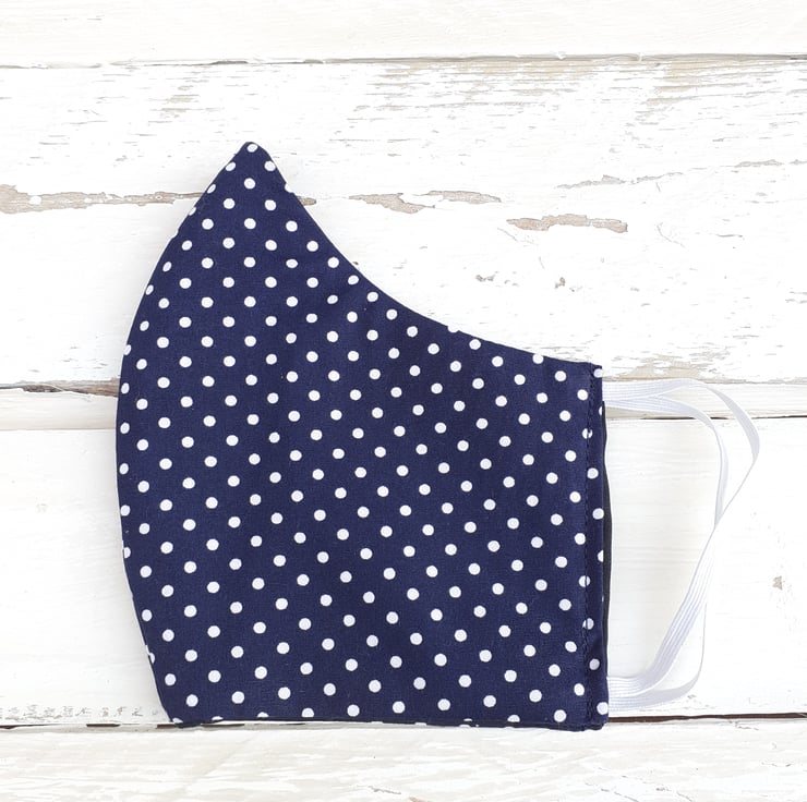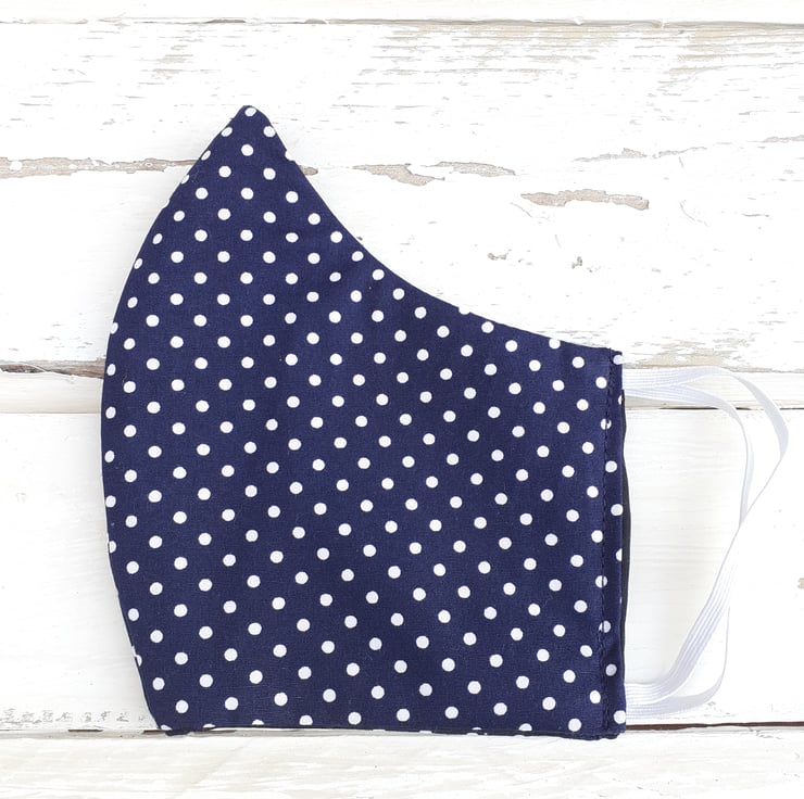 Made from navy blue cotton with white polka dots on one side and navy fabric on the other.