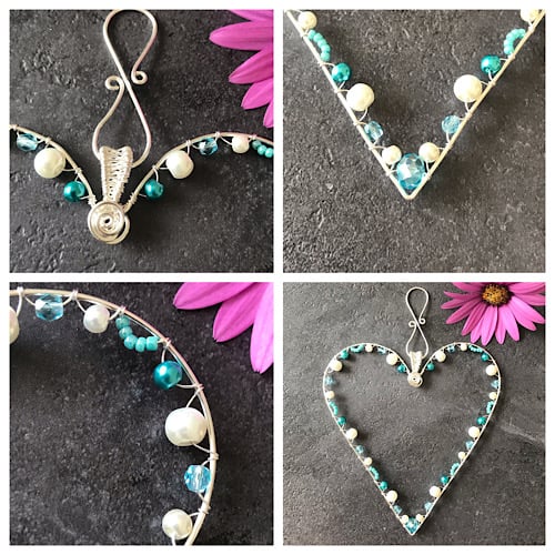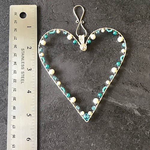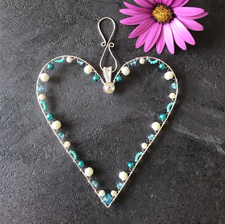 This pretty heart is handmade made with silver filled wire and a selection of turquoise and clear crystal beads, white glass pearls and turquoise seed beads. I have formed the silver wire into a heart shape and wrapped the beads around the heart shape. A handcrafted hook is included for hanging the heart.