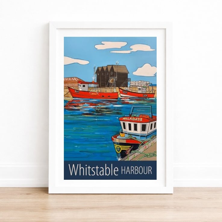 A contemporary travel poster style print of the harbour in Whitstable, Kent, from my own original acrylic painting. A perfect gift for those who love Whitstable!