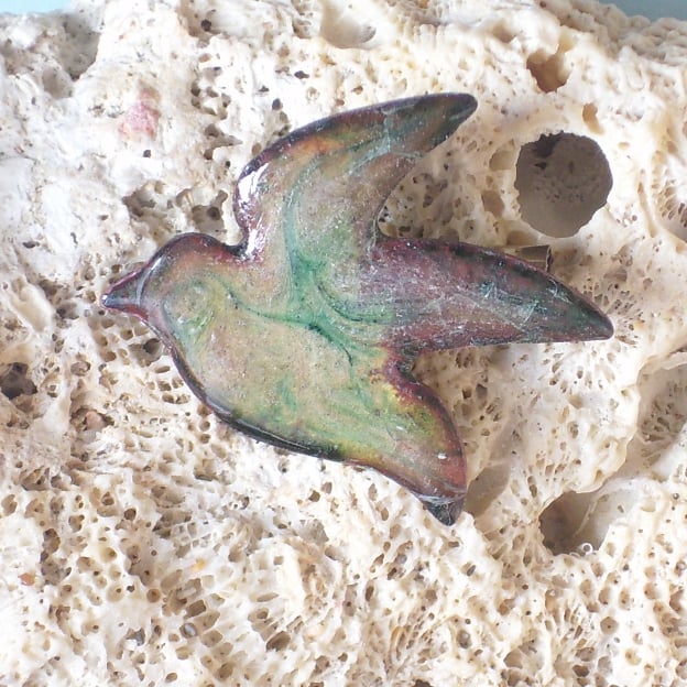 I have laid brown enamel over a base layer of clear enamel built up on the copper base. The copper base shows through the brown in tones of golden brown. I have then added a scatter of green enamel through which I have drawn a steel tip while the shape was red hot, to create the swirled pattern on the bird.