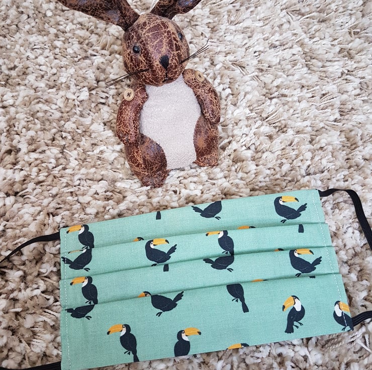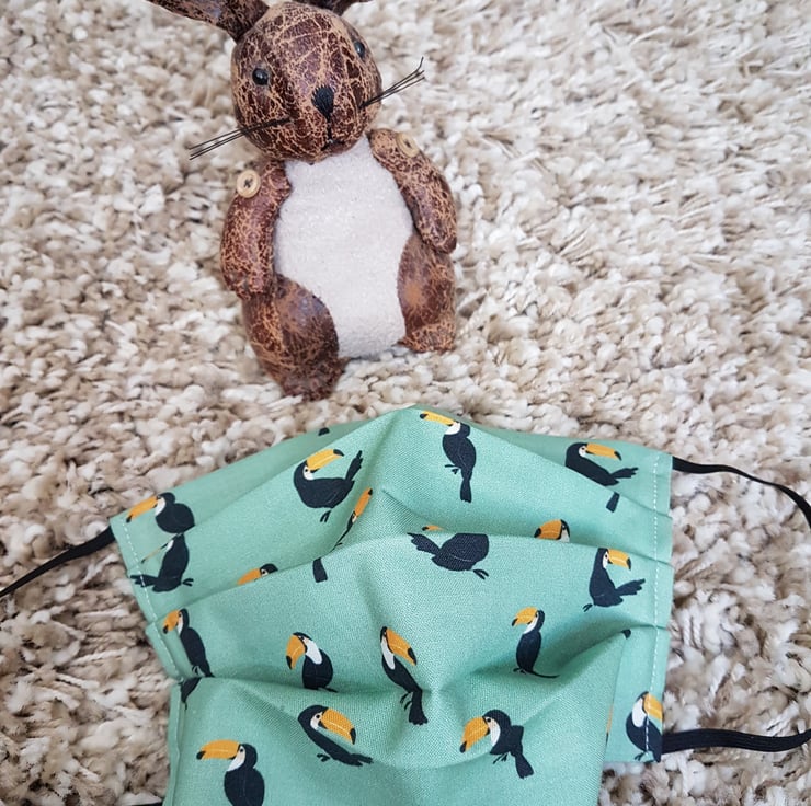 Small Adult or Teenager face covering/mask made from a green tucan print cotton. The face mask is made with 2 layers of cotton forming an inner pocket for a filter (not included) and is fastened over the ears with 2 loops of elastic.