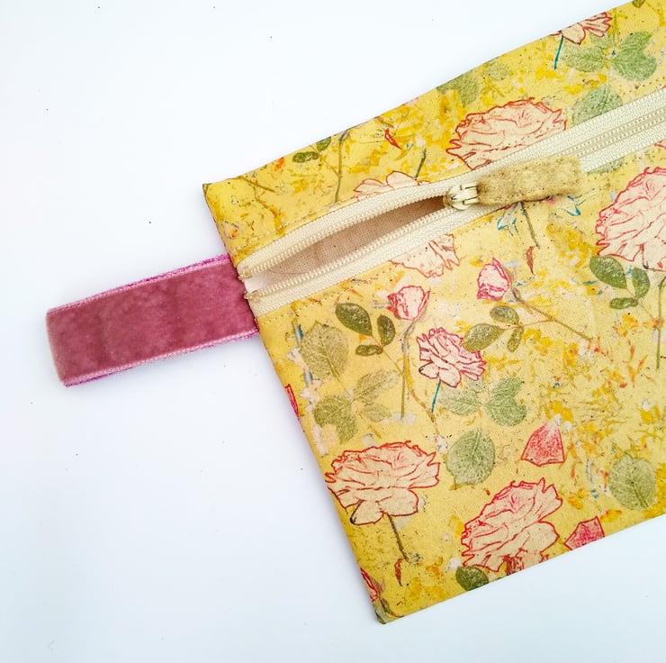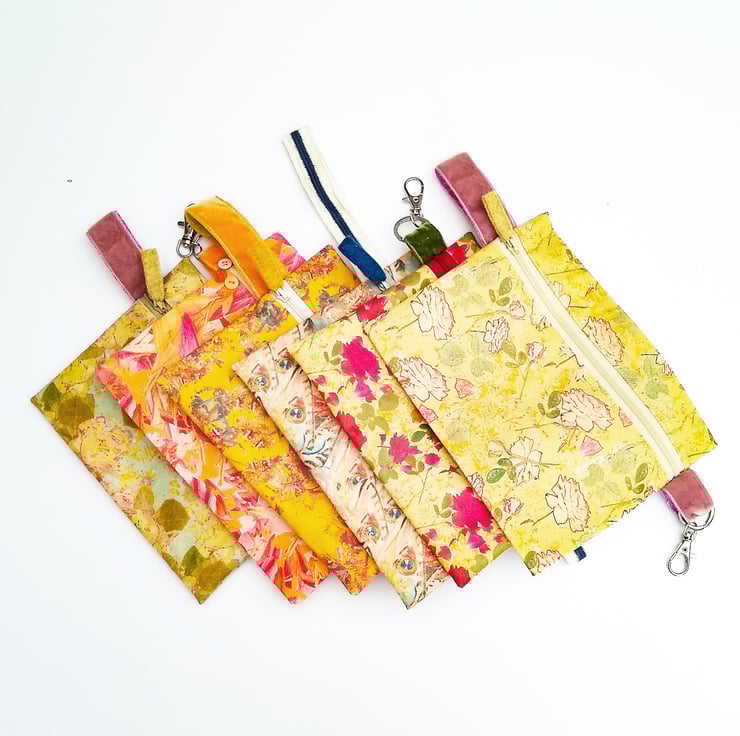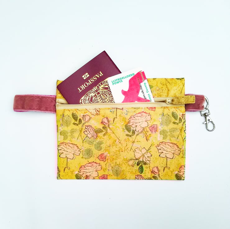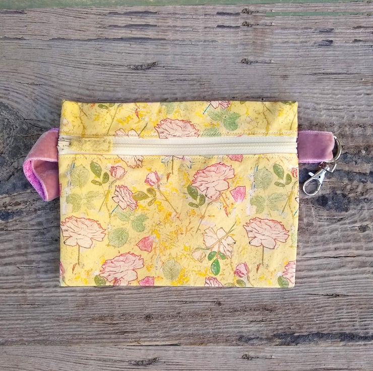 A handy small zip pouch with swivel clip, large enough to hold all those little bits and bobs. My Tea Rose design has been 'heat transferred' onto pre-washed calico, giving the surface a crumpled aged oilcloth appearance. The pouch is lined in washed calico and finished with felt-lined velvet ribbon and a felt zip pull.