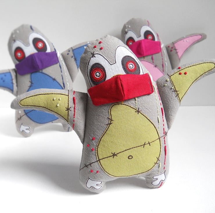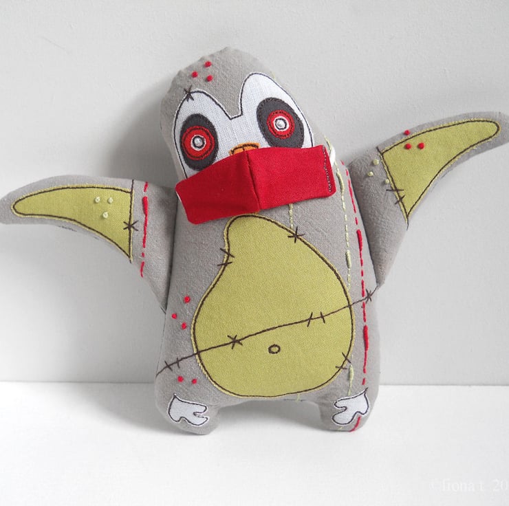 commemorative 2020 face mask zombie penguin - applique, free motion & hand embroidered, size big-ish. green with red face mask.