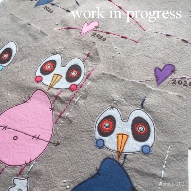 cotton fabrics are appliqued, and the details drawn on with free machine embroidery.