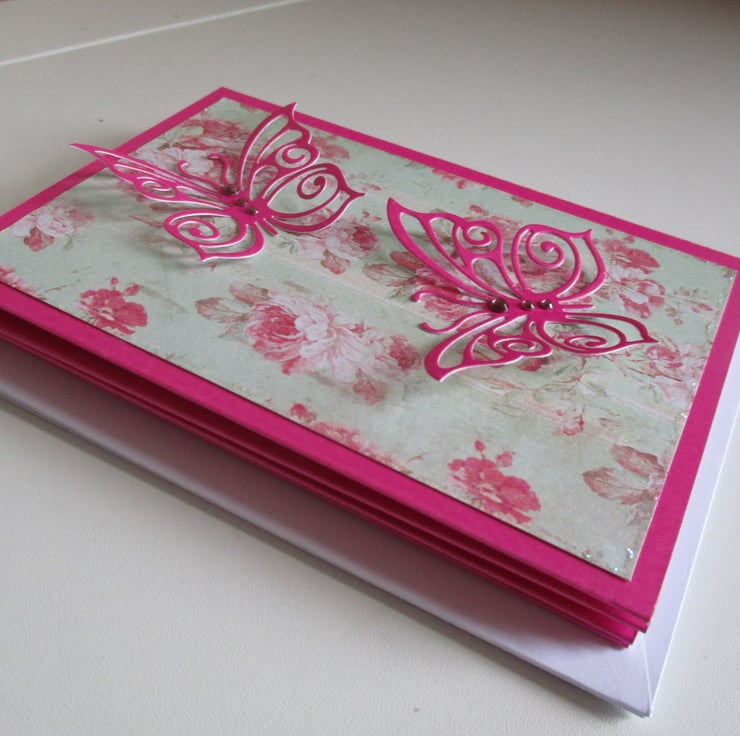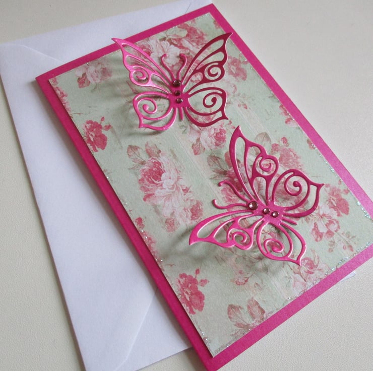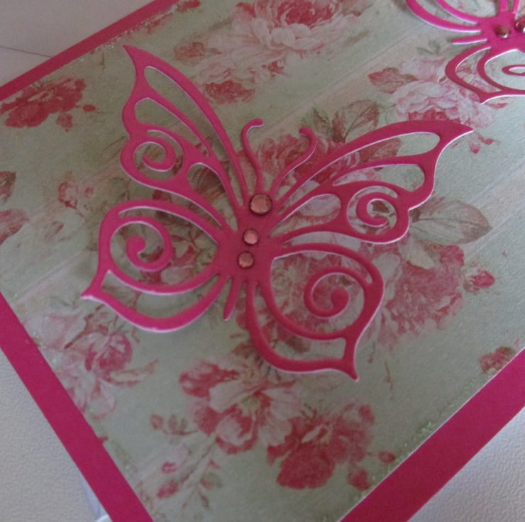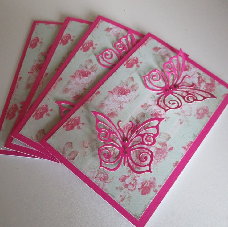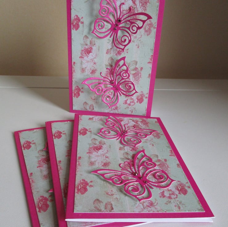 Each card is created from a bright pink pearlescent card, layered with a lovely green and pink rose design paper and 2 intricate die cut butterflies in the same bright pink card.