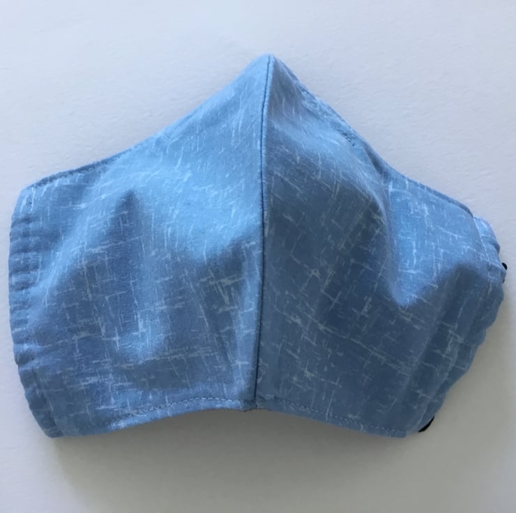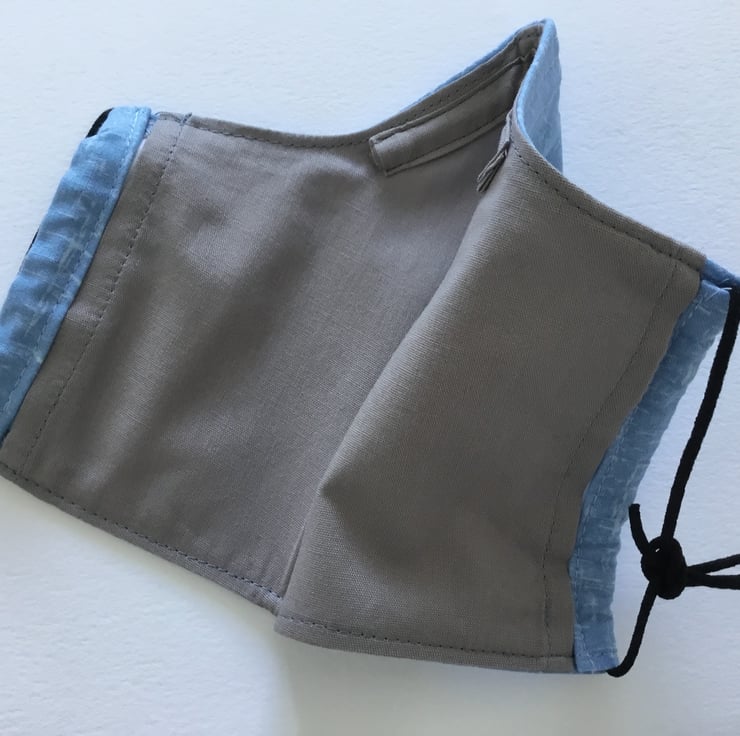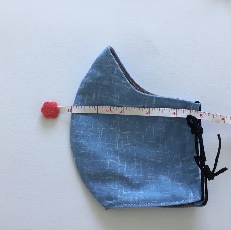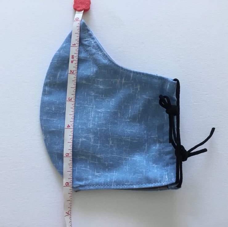 Larger size face covering in 3 layered cotton with elastic ear loops for you to adjust to size, also has a removable nose wire which should be removed before washing. Can be washed at 40 low tumble dry.