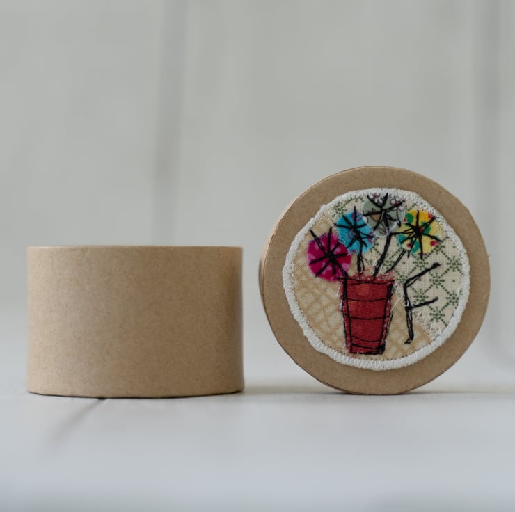 A little vase of flowers and the initial "F' have been free motion embroidered, (drawn with the sewing machine), to decorate this round papier mache box, creating an individual decorative item. It could be used as a gift box, to keep safe that special piece of jewellery, or simply as a decorative piece.