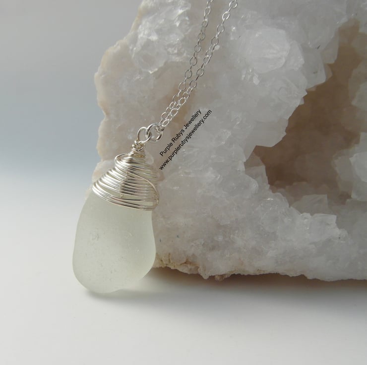 A beautiful tear drop shaped white Cornish sea glass wire wrapped in silver wire.