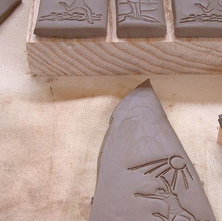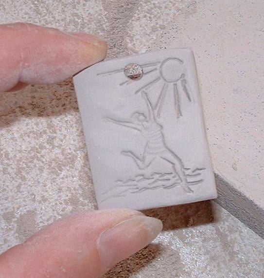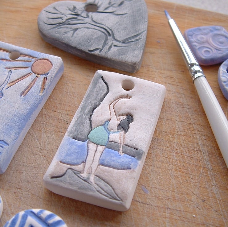 After forming my pendants from fine white clay, I imprint my design. When dry, I sand the back and sides of the pendants and round off the corners to ensure they are super smooth. They then have their first firing. Next I paint them using under-glazes and apply a transparent glaze before firing again to earthenware. Being glazed all over they are smooth against the skin whilst retaining the texture of the imprinted design. The result is a pleasantly tactile item.