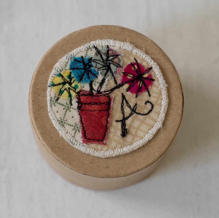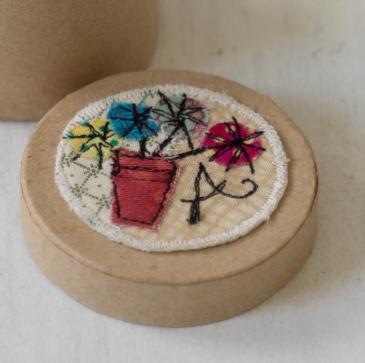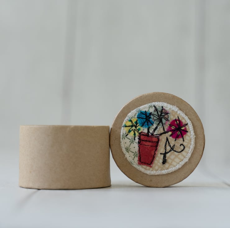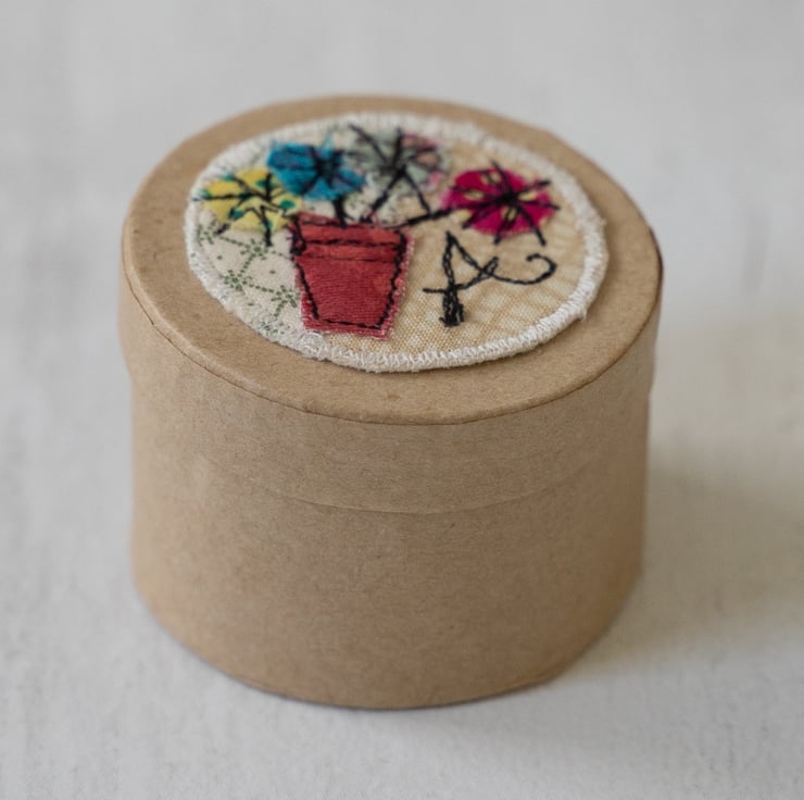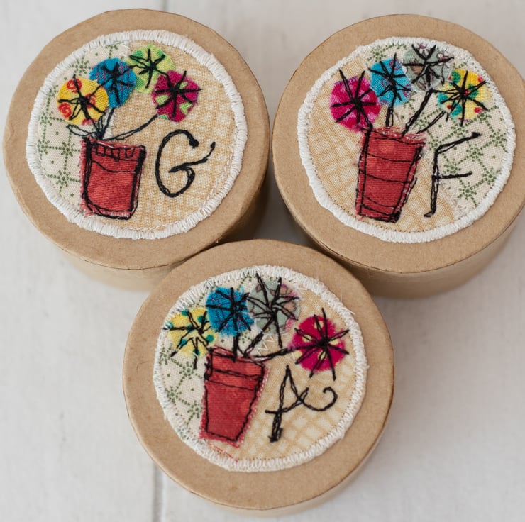 A little vase of flowers and the initial "A' have been free motion embroidered, (drawn with the sewing machine), to decorate this round papier mache box, creating an individual decorative item. It could be used as a gift box, to keep safe that special piece of jewellery, or simply as a decorative piece.