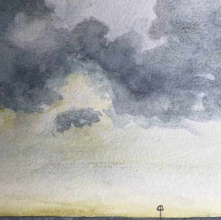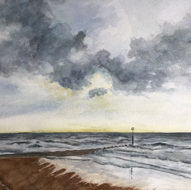 The image of the dark stormy sky and rolling waves whilst walking along the beach during a storm in Bournemouth inspired me to paint this artwork.