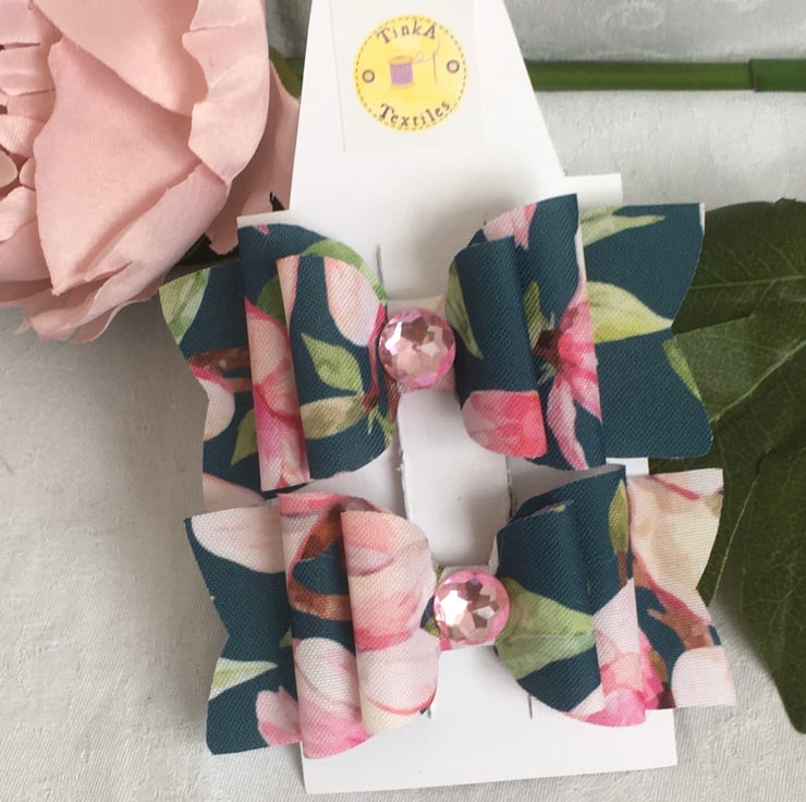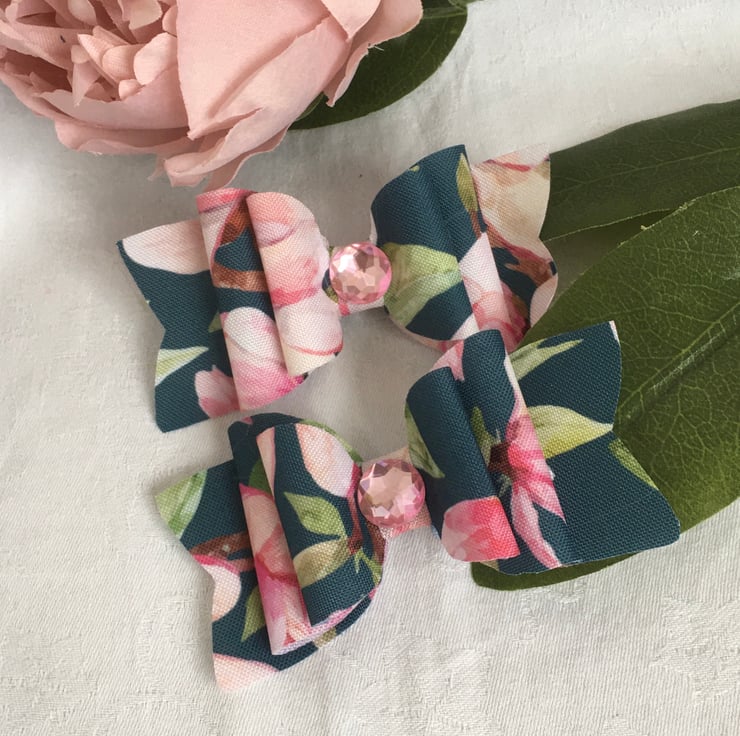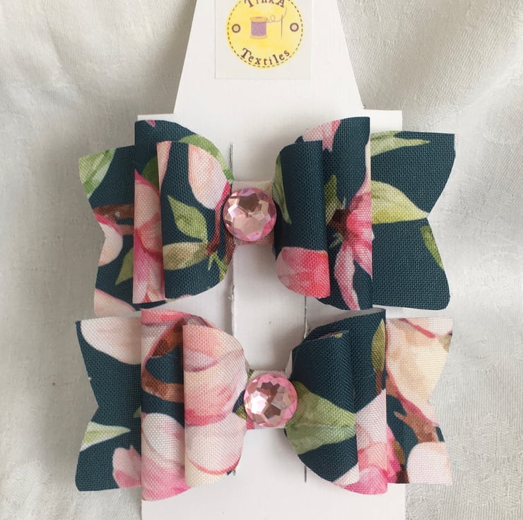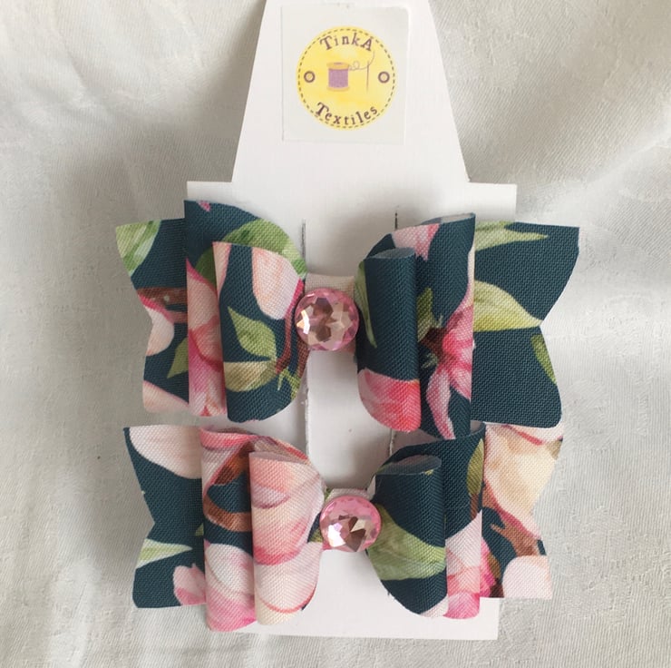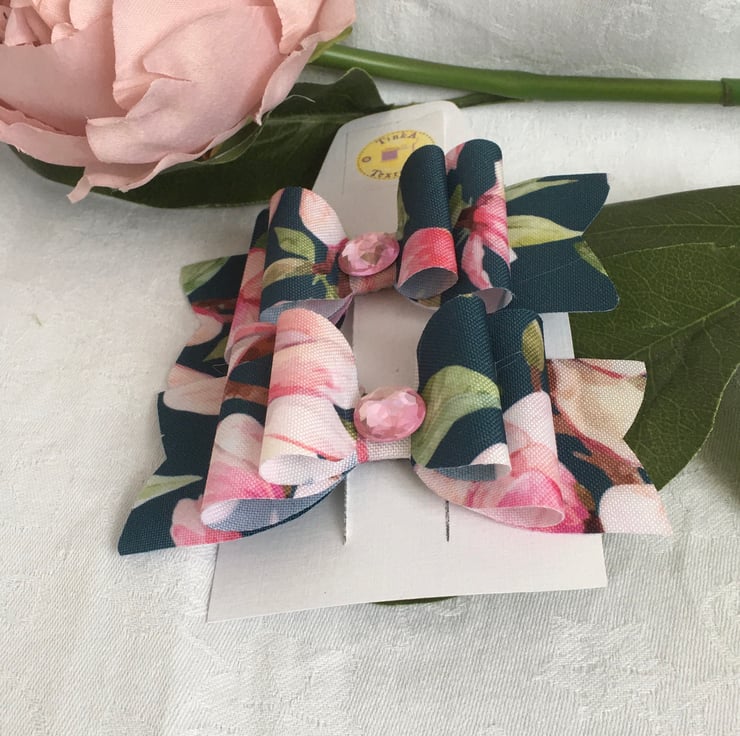 Each hair clip has been beautifully handmade with waterproof cotton Magnolia print fabric and embellished with a large gem, for sparkle and finished with strong, sturdy crocodile clips.