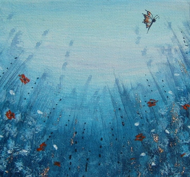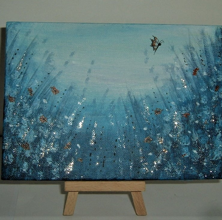 Painted on solid canvas board in acrylic paints, it also contains glitter.